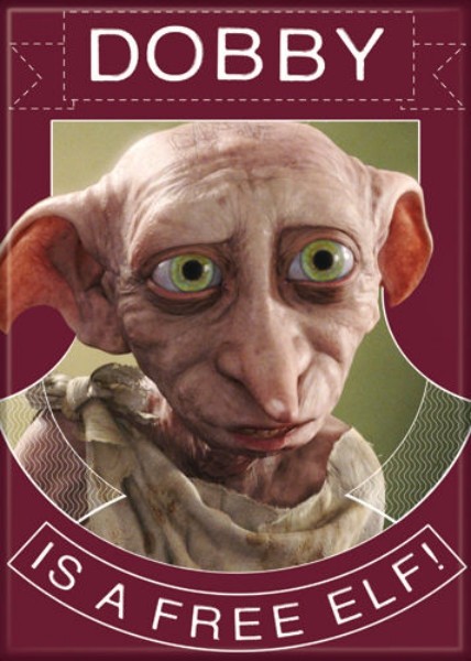 This is a licensed 2.5″ x 3.5″ magnet featuring the photo image of Dobby saying “Dobby Is A Free Elf!” as seen in the Harry Potter movies. It is new and unused and stored in a smoke and pet free environment.