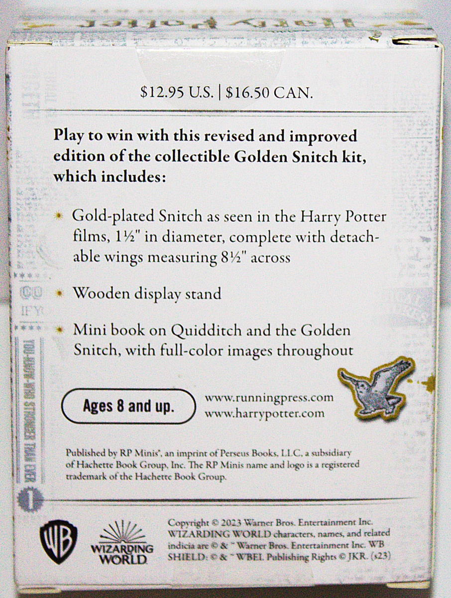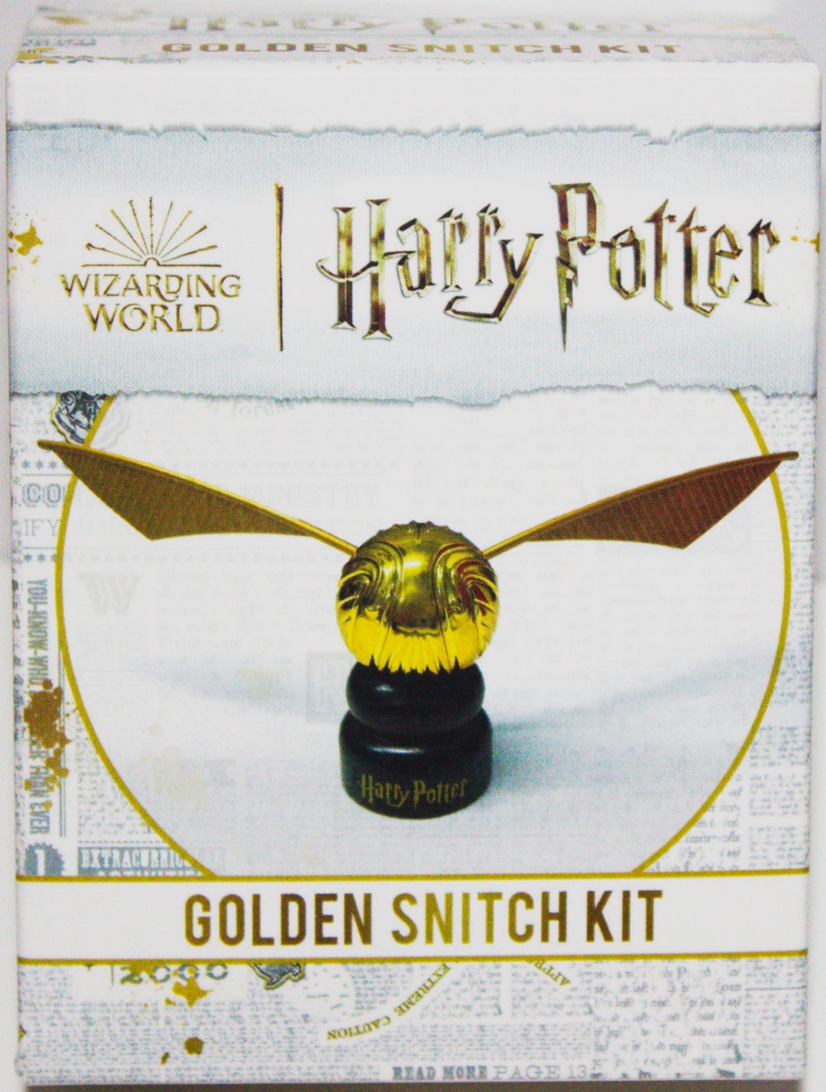 Play to win with this new and improved edition of the collectible Golden Snitch kit, now with gold-plated snitch and wings, upgraded base, and all-new illustrated book. Perfect for fans of Quidditch and the Wizarding World of Harry Potter! This is an authentic replica of the Golden Snitch as seen in the Harry Potter films that measures approximately 1.5 inches in diameter and complete with detachable gold wings measuring 8.5 inches in length. It includes a wooden display stand for your Golden Stitch, complete with Harry Potter logo. There is also a 48-page 2.5 x 3 inch book that features information about Quidditch and the golden snitch with quotes and full-color images from the movies. The iconic Golden Snitch is a perfect gift or self-purchase for Harry Potter fans. This is a new, sealed copy that we purchased direct from the publisher and it has been stored in a smoke and pet free environment.