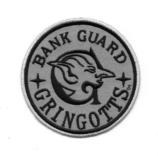 This mint, unused 3.75″ diameter embroidered patch features the Gringotts Bank Guard logo, as seen in the Harry Potter movies and at Universal Studios. It has a glue backing for easy application to hats, shirts, jackets and bags and is stored in a smoke and pet free environment.