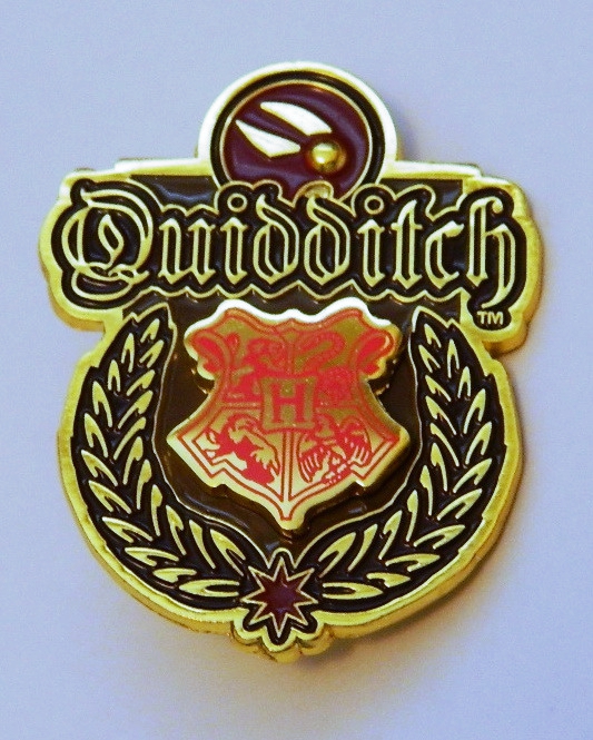 This mint, unused 2″ high metal enamel pin features the Quidditch team logo crest of the Hogwarts School of magic, as depicted in the books and seen in the Harry Potter movies. It is engraved with a raised Hogwarts crest logo in the center. A very elaborate pretty pin stored in a smoke and pet free environment.