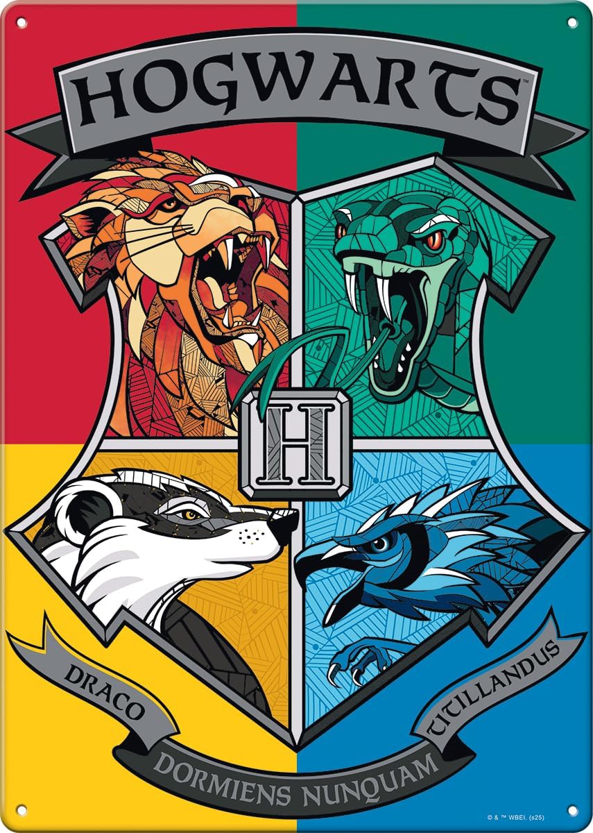 This is an 11.5″ x 8.25″ heavy grade metal sign poster that features the four houses crest logo for the Hogwarts School of Wizardry from the Harry Potter movies and books. These are produced in the style of the original metal signs that were common in the first half of the 20th century. It is a new, never used sign, complete with pin holes in the corners for easy hanging as well as a plastic tab on the top back side and protected in shrink wrap. These also look very nice framed. It has been stored in a smoke and pet free environment.