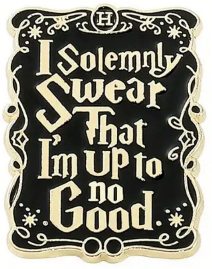 This new, unused 1.25″ high x ,875″ wide metal enamel pin features the phrase “I Solemnly Swear That I Am UP To No Good” in a filigree design, as depicted in the books and seen in the Harry Potter movies. This has not been a widely distributed pin, found usually at sci-fi and comic conventions and it has been stored in a smoke and pet free environment.
