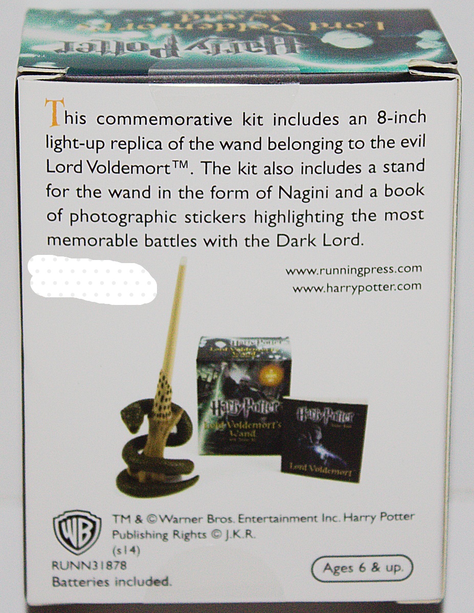 This is one of a series of mini books about Harry Potter that comes with a Harry Potter toy, model or special effect. Bring home a deluxe piece of Harry Potter’s wizarding world with this commemorative Lord Voldemort wand-and-stand kit! The set includes: an 8-inch light-up replica of the wand belonging to Lord Voldemort, a One-of-a-kind wand stand in the form of Nagini and a Book of 8 photographic stickers highlighting the most memorable battles with the Dark Lord. This is a new, sealed copy that we purchased direct from the publisher and it has been stored in a smoke and pet free environment.