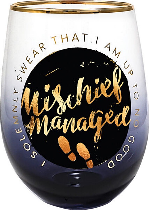 This is a new and unused 16 ounce clear curved stemless table/wine glass featuring the Mischief Managed logo surrounded by the words “I solemnly swear that I am up to no good” from the Harry Potter movies and books. It is a two-tone glass with a gold rim and is stored in a smoke and pet free environment.
