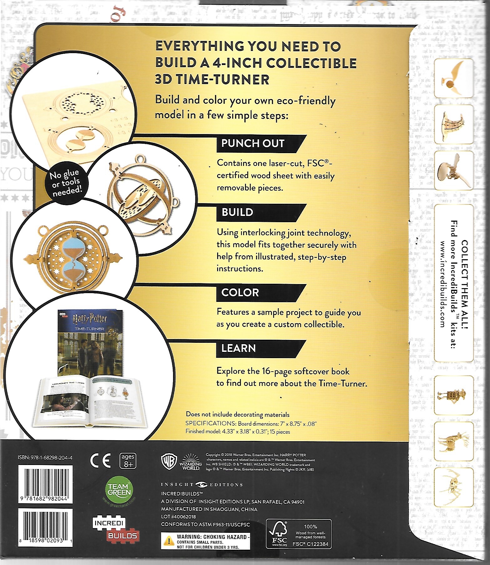 You can build your own customizable Time-Turner, with this thrilling softcover book and 3D wood model set from IncrediBuilds. In the Harry Potter films, Hermione used this magical timepiece to save Sirius Black and Buckbeak but others have tried to used to cause harm. Now the famous instrument is yours to build and customize with this deluxe model set, accompanied by a 16-page booklet featuring concept art, unit photography, and other imagery from the films. The booklet is packed with interesting behind-the-scenes details, including notes from the filmmakers, cast commentary, and snapshots of key moments. The wood model is easy to assemble and snaps together to form a dynamic displayable version of the Time-Turner that fans can color and craft any way they want!