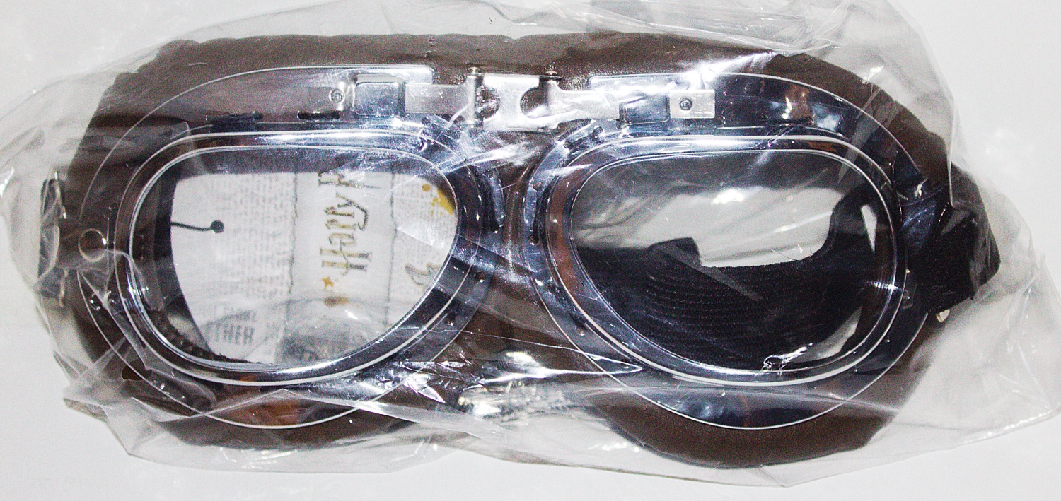 This is a new, unused, set of Officially Licensed Hagrid Motorcycle Goggles as seen in the hit Harry Potter movies. They are made of a heavy vinyl with thick stitching with metal support across the front. The lenses are plastic and you attach using a nylon strap with an adjuster. No longer being made, they have been stored in a smoke and pet free environment.