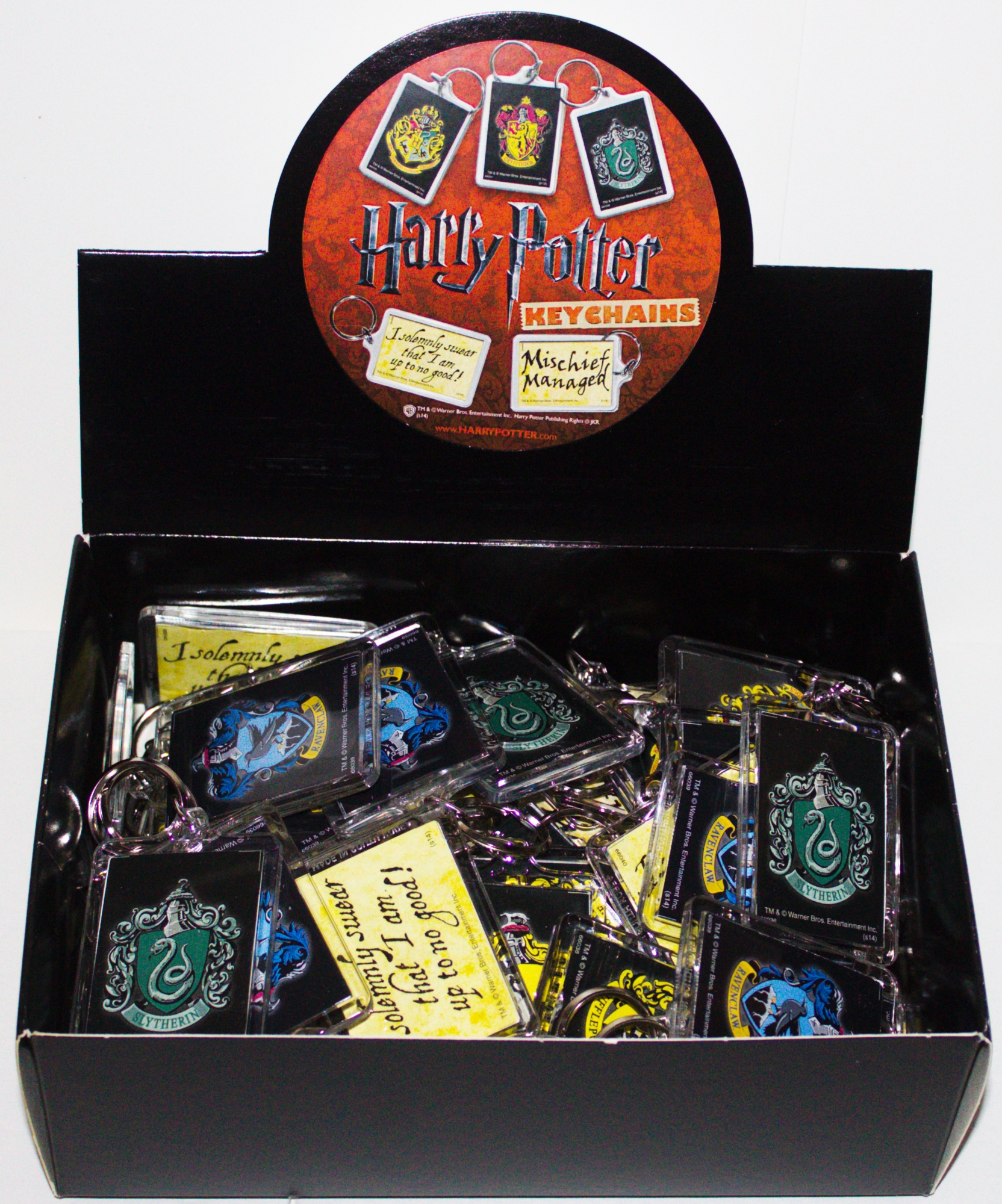 Produced by ATA-BOY, this is a licensed set of 50, 2.25″ x 1.75″ Lucite key chains featuring 7 different phrases and images from the popular Harry Potter movies. This is a new, never used assortment that comes in an illustrated display box and is stored in a smoke and pet free environment.