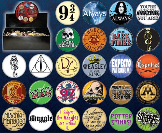 Produced by ATA-BOY, this is a licensed set of 144, 1.25″ wide metal buttons featuring multiple photo images from the popular Harry Potter movies.