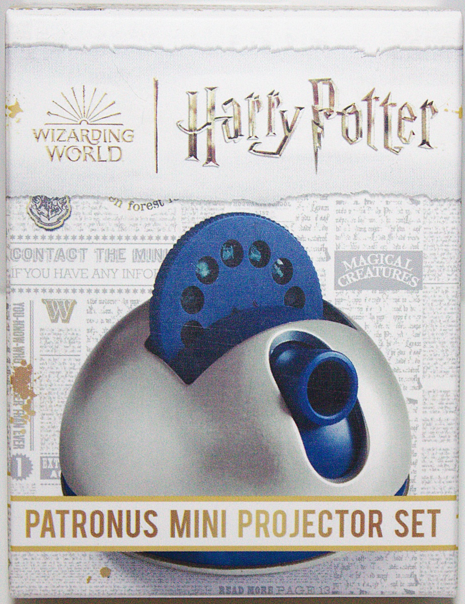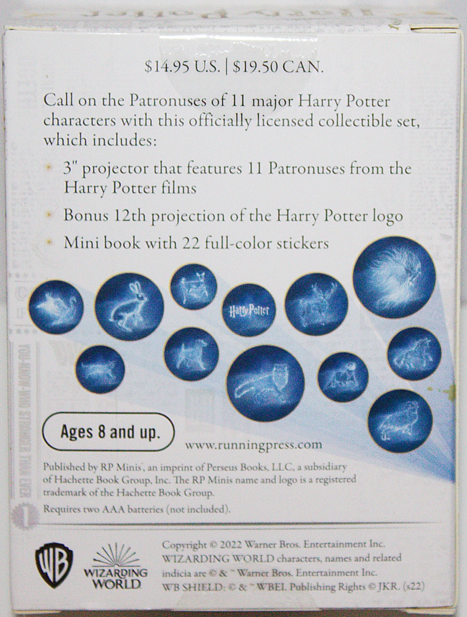 Expecto Patronum! Call on the Patronuses of 11 major Harry Potter characters with this officially licensed collectible set. This 3-inch projector features 11 Patronuses from the Harry Potter films and projects them across a 5-foot distance. Bonus 12th projection of the Harry Potter logo also included. You also receive a mini sticker book that includes 22 full-color stickers. A unique and keepsake item for all fans of Harry Potter. This is a new, sealed copy that we purchased direct from the publisher and it has been stored in a smoke and pet free environment. Requires two AAA batteries (not included).