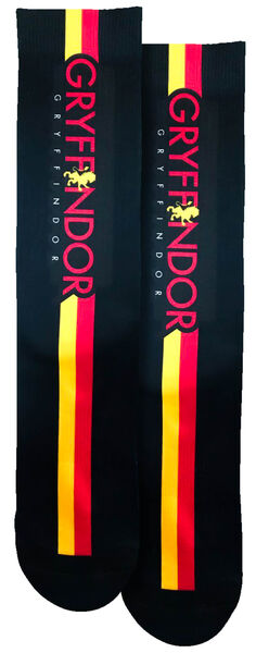 This is a new and unused pair of red and gold on black 15″ long licensed tube socks with a lion logo for the Gryffindor house from the hit series of Harry Potter movies. Designed as a one size fits men shoe size 5-10 and women 7-12, they are made of 82% Poly 16% cotton and 2% Spandex and are machine washable. They are stored in a smoke and pet free environment.