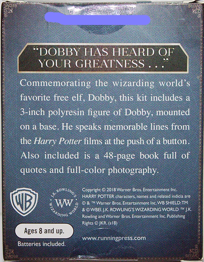This is one of a series of mini books about Harry Potter that comes with a Harry Potter toy, model or special effect. This one-of-a-kind talking collectible of the wizarding world’s most beloved free elf, Dobby! is a perfect gift for fans of the Wizarding World. The set includes a 3-inch polyresin figure of Dobby, mounted on a base. He speaks several memorable lines from the Harry Potter films at the push of a button. In addition you get a 48-page book full of quotes and full-color photography. This is a new, sealed copy that we purchased direct from the publisher and it has been stored in a smoke and pet free environment.