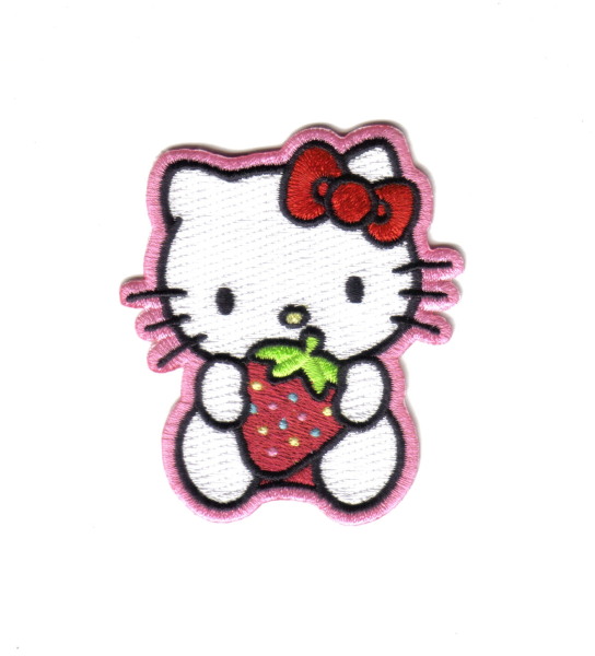 This mint, unused 3″ high embroidered patch features Hello Kitty holding a strawberry. It has a glue backing for attaching to shirts, hats or backpacks with an iron or heat press.