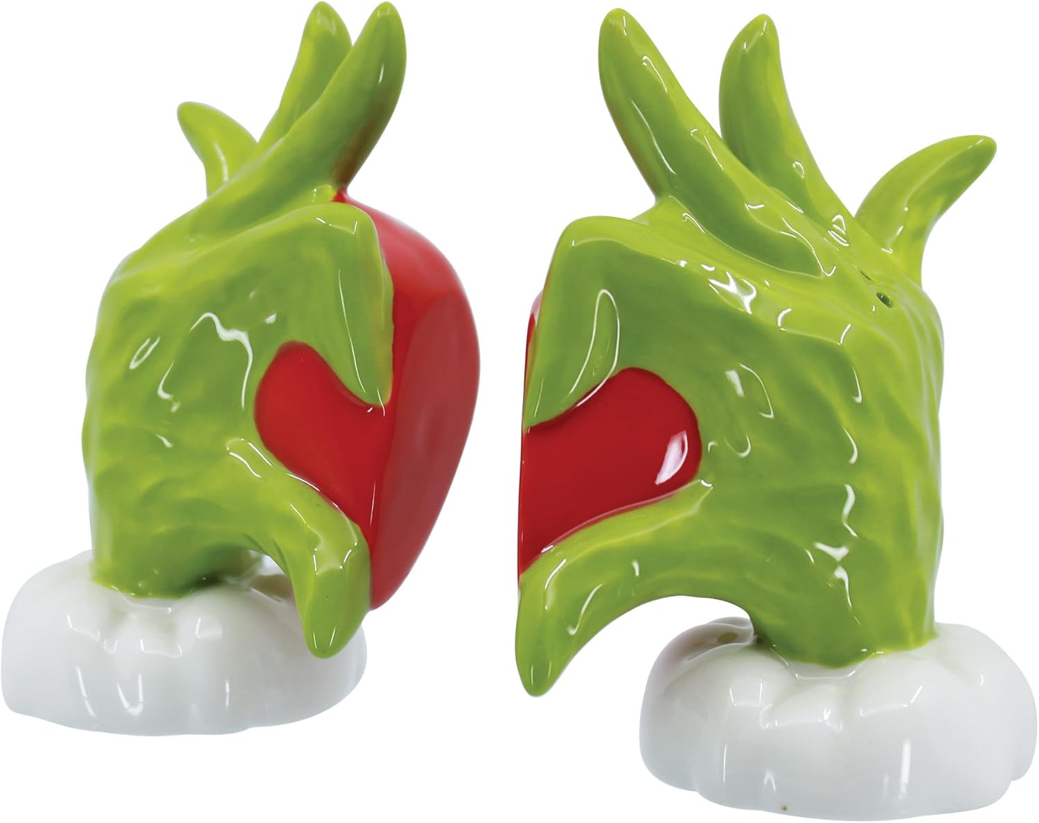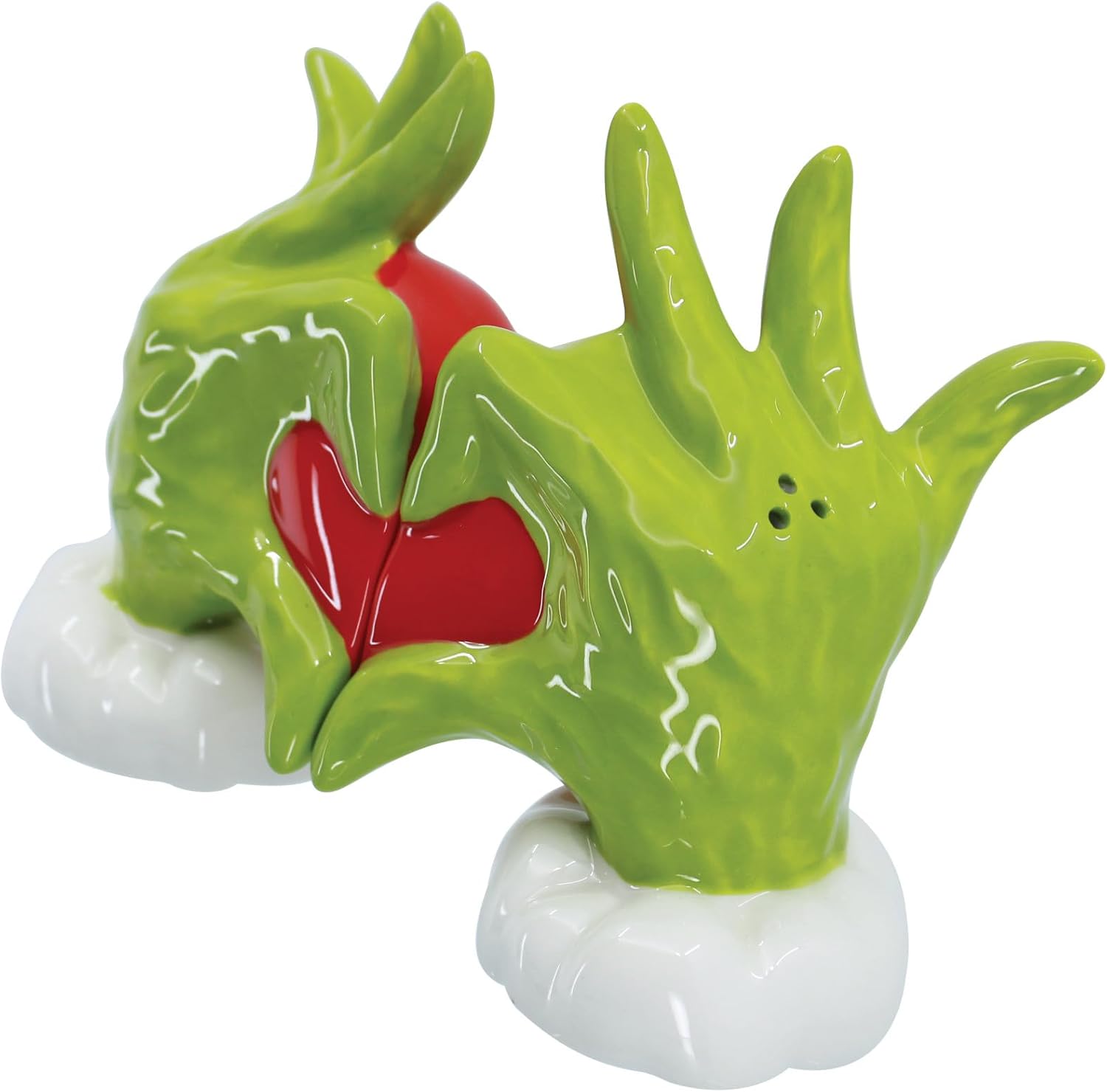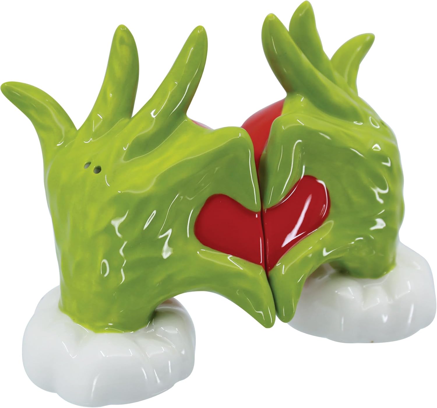 This is a ceramic collectible where the Grinch character holds a heart in his hands to represent his heart growing three sizes, as depicted in Dr. Seuss’s How the Grinch Stole Christmas!. This popular set from Enesco is hand-painted and designed to be a festive home decor item. Measuring 4″ high, this two piece salt and pepper set is sure to get attention this holiday season and the rest of the year as well. It is produced from high quality stoneware and is hand painted. Hand wash only. New and unused, it ships in an illustrated box and is stored in a smoke and pet free environment.