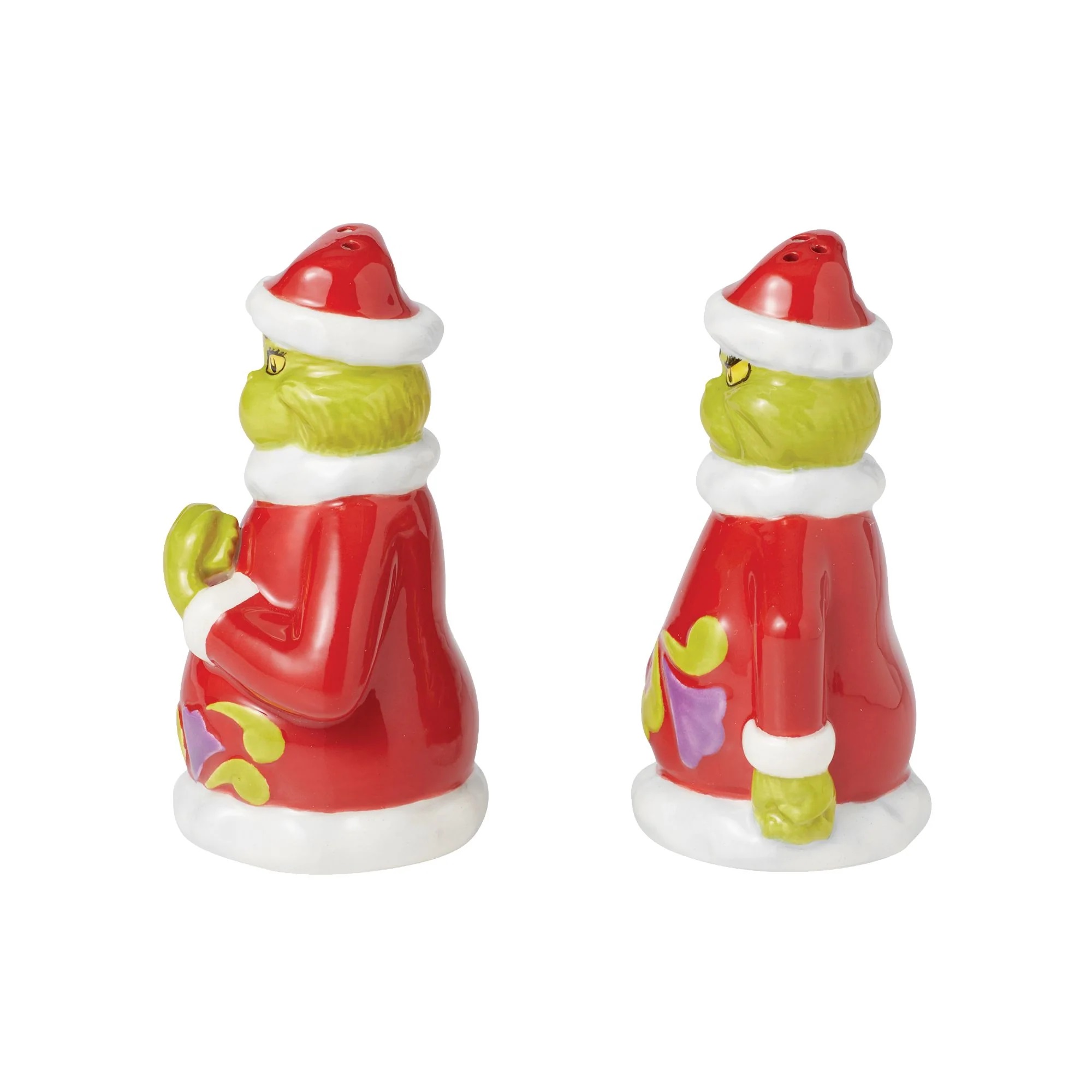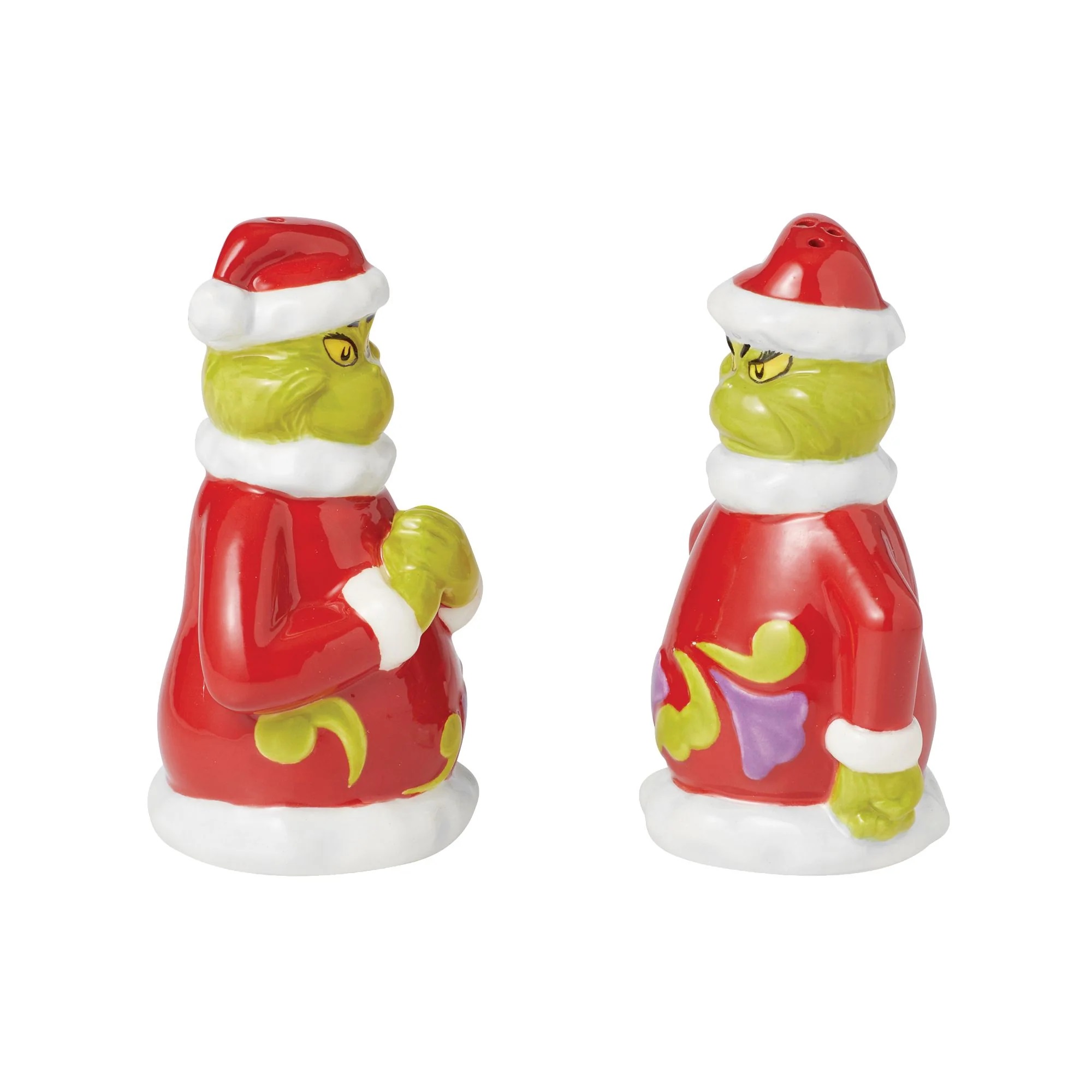 These festive salt and pepper shakers from Jim Shore feature the two sides of The Grinch. One Naughty, the other Nice, this set of seasonings bring style and spice to your holiday home decor. Measuring 3.75″ high, this two piece salt and pepper set is sure to get attention this holiday season and the rest of the year as well. It is produced from high quality stoneware and is hand painted. New and unused, it ships in an illustrated box and is stored in a smoke and pet free environment.