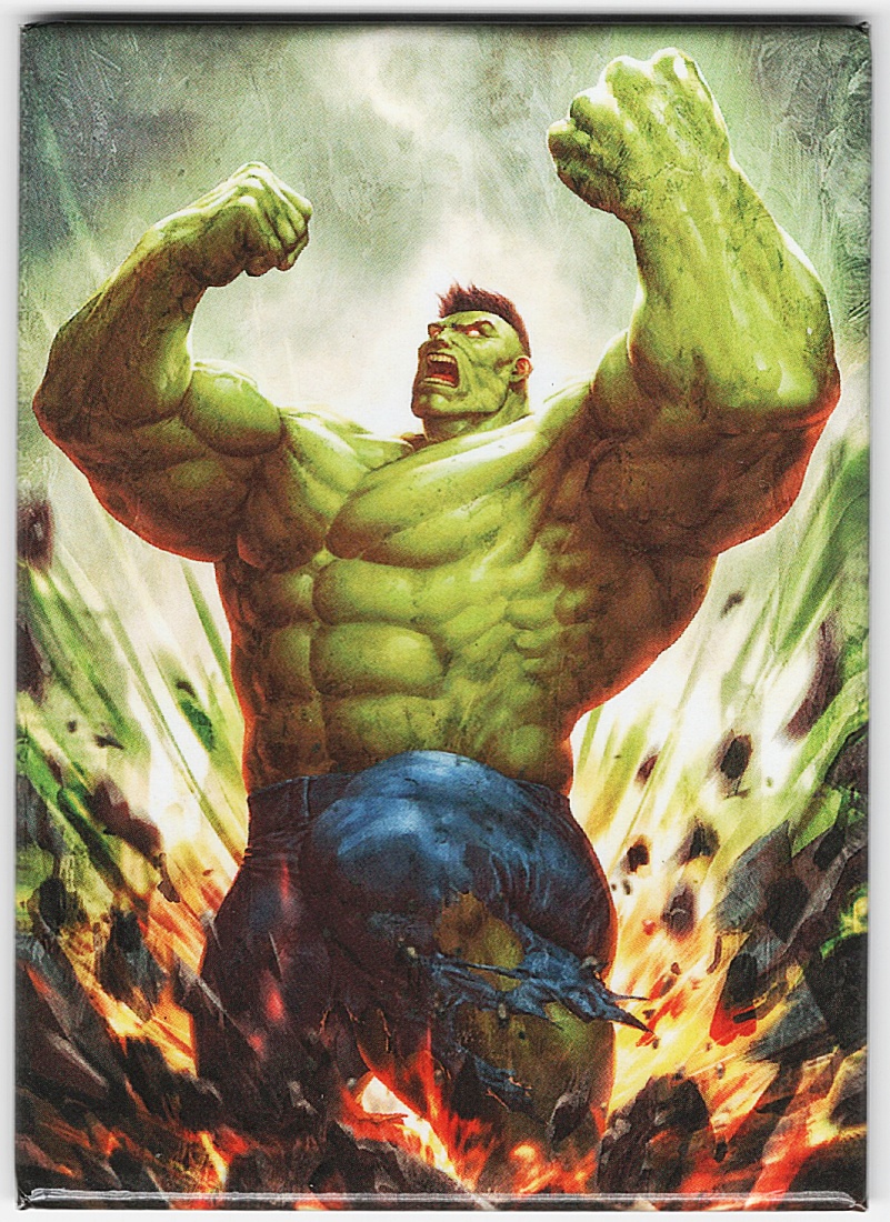 Produced by Ata-Boy, this is a licensed, large 2.5″ x 3.5″ magnet featuring and image of the Incredible Hulk as seen in Marvel Comics. This is a new, unused magnet stored in a smoke and pet free environment.