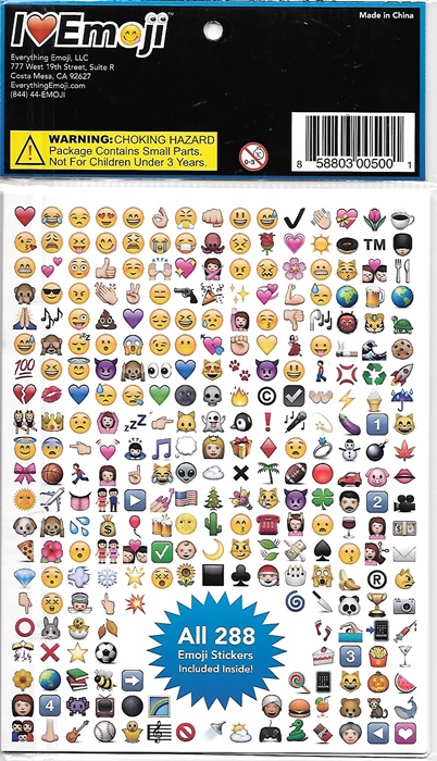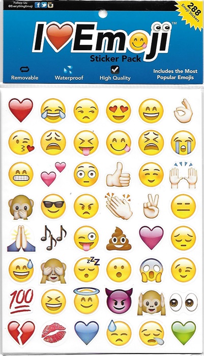 This is a package of 288 of the more popular Emoji images. Includes all Emojis as seen on the iPhone, Instagram, Facebook, Twitter, and More! These are REAL die cut stickers that you can stick anywhere! Each sticker is about the size of a nickel. They come in a sealed package and are stored in a smoke and pet free environment.