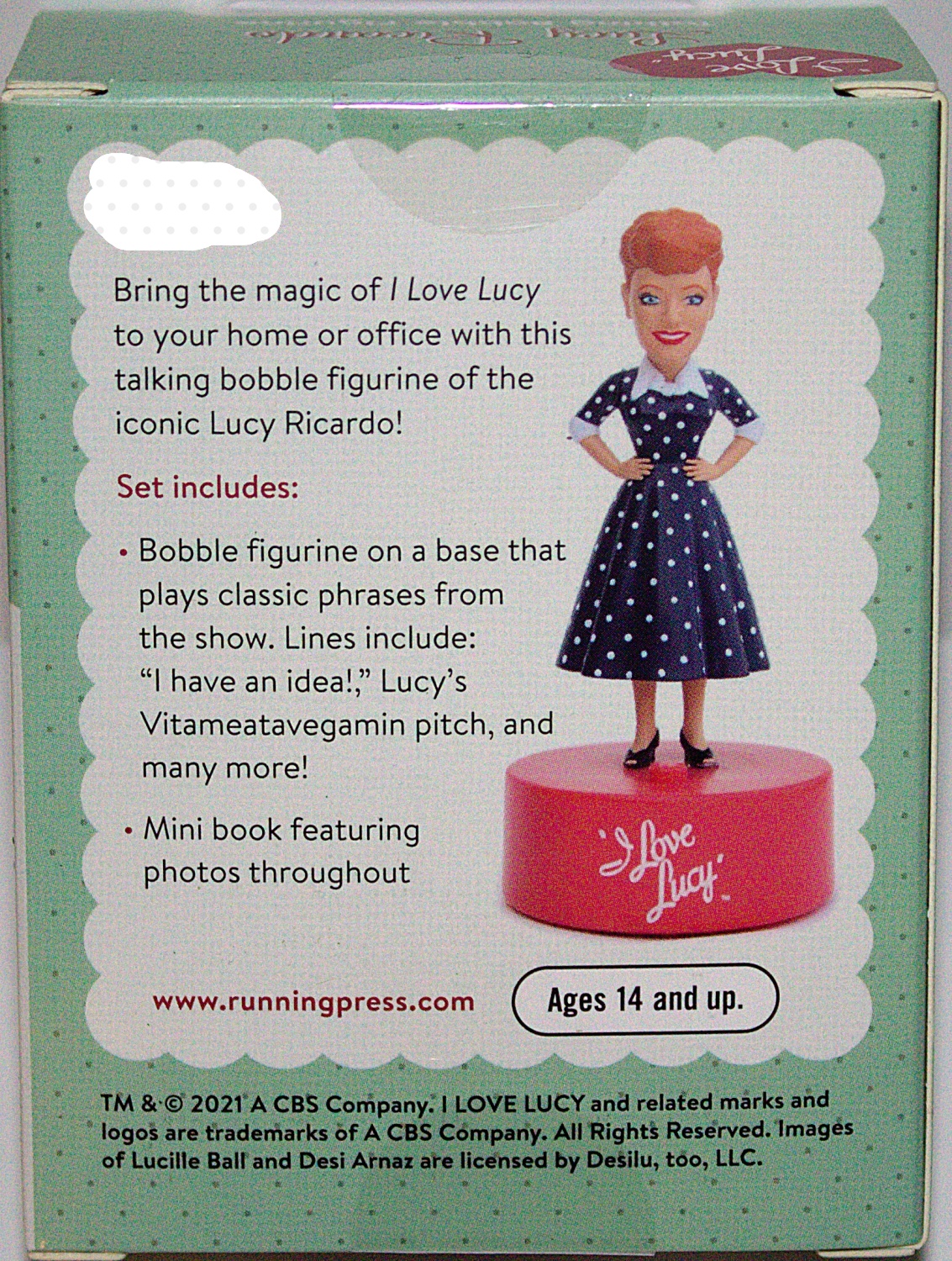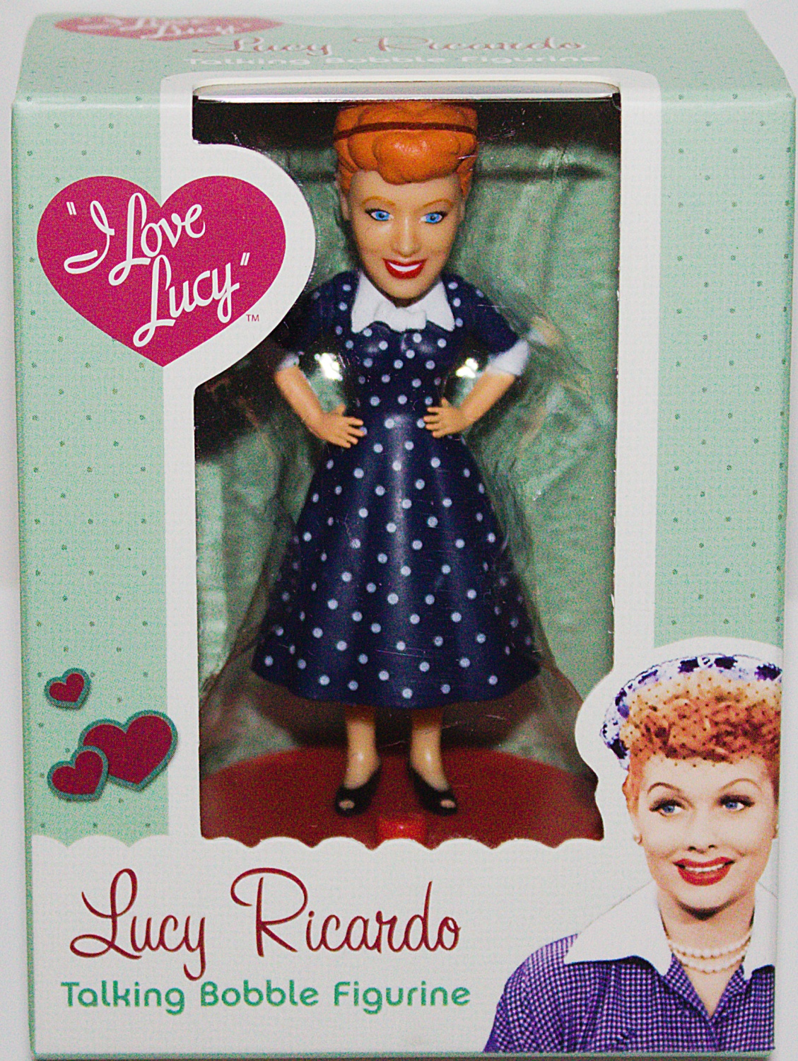 Bring the magic of I Love Lucy, the classic television show, to your home or office with this one-of-a-kind talking bobble figurine of the iconic Lucy Ricardo! This set includes: a 3.5″ full-color Lucy Ricardo bobble figurine on an I Love Lucy-branded base. When pressed, the base says classic Lucy phrases from throughout the show’s run. Lines include: “Ewww,” “I have an idea!,” “I’m a dipper from way back . . .,” Lucy’s Vitameatavegamin pitch, and more! Thee is also a mini book featuring photos from I Love Lucy throughout. This is a new, sealed copy that we purchased direct from the publisher and it has been stored in a smoke and pet free environment.