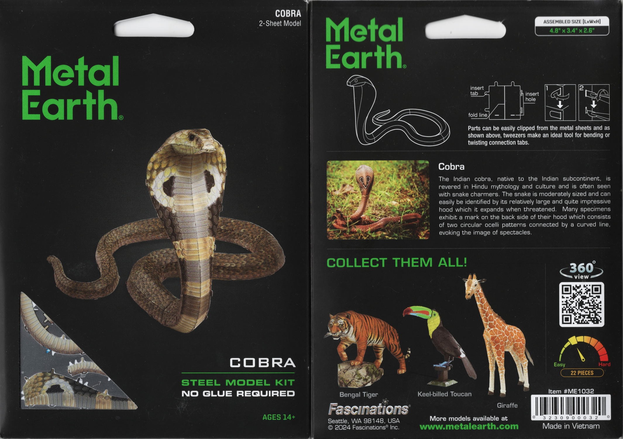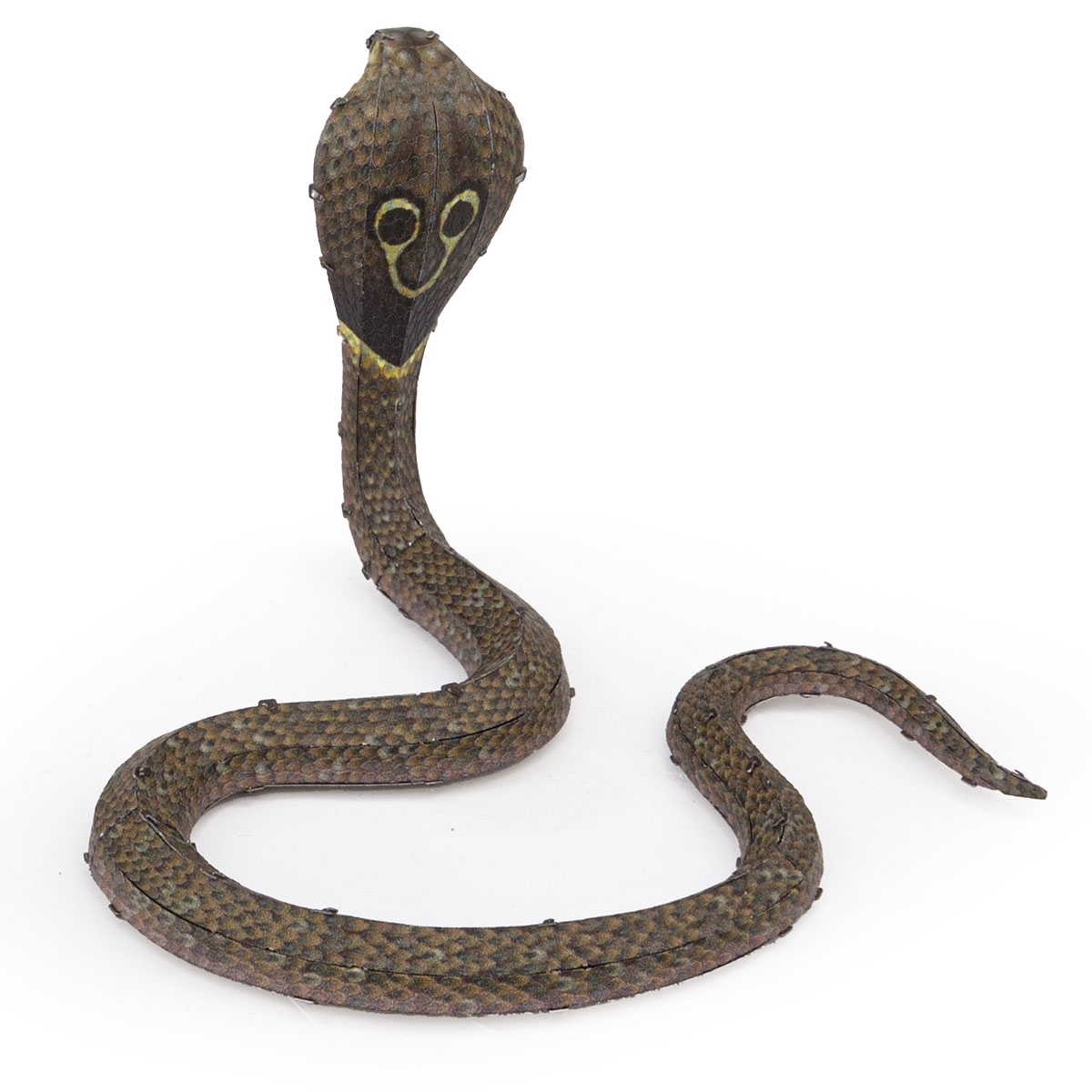 This amazingly detailed model starts as two 4″ square sheets and finishes as a 3-D model. It measures 4.8″ L x 3.4″ W x 2.6″ H when assembled and this one features an Indian Cobra snake. The Indian cobra, native to the Indian subcontinent, is revered in Hindu mythology and culture and is often seen with snake charmers. The snake is a moderately sized and can easily be identified by its relatively large and quite impressive hood which it expands when threatened. Many specimens exhibit a mark on the back side of their hood which consists of two circular ocelli patterns connected by a curved line, evoking the image of spectacles. The sheets contain detailed laser etching for easy removal. Complete instructions are included to show you how to pop out the pieces, bend the tabs, and connect them at the attachment points with an average assembly time of 45-60 minutes and is considered moderate difficulty. It has been stored in a smoke and pet free environment. We also offer an optional LED base (blue or white lights) or a Solar Powered Spinner for better display of your model.