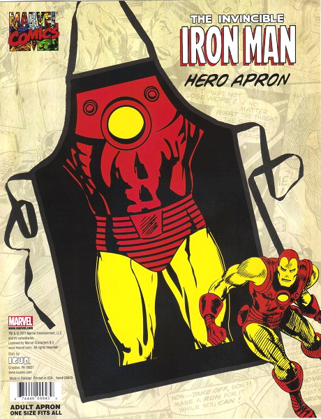 This is a black, red and yellow polyester adult apron featuring the body image of Marvel Comics superhero Iron Man on the front. This is a new, unworn apron still in its original packaging stored in a smoke and pet free environment.