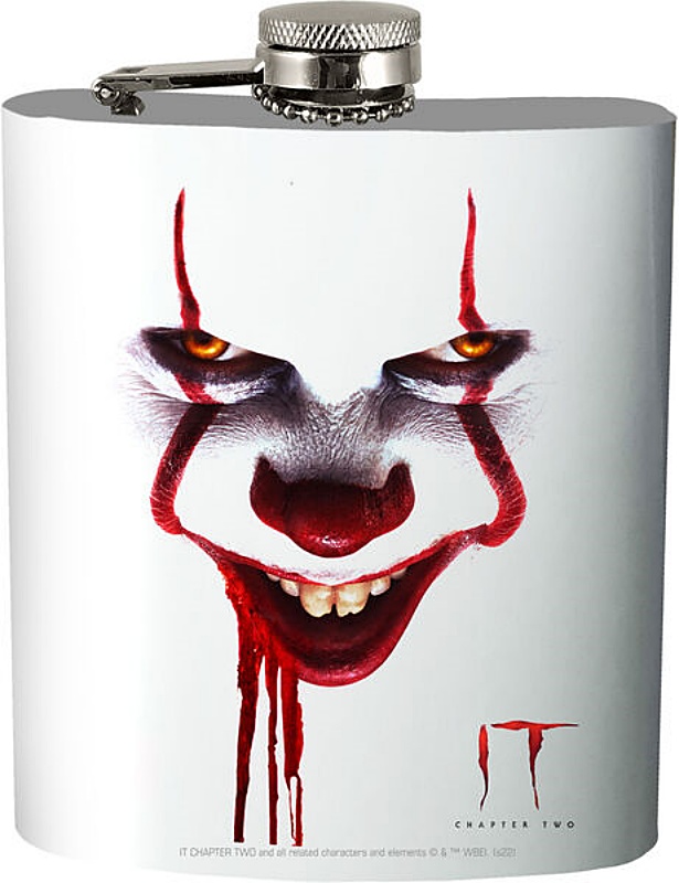 This is a 7 oz stainless steel flask featuring the poster image face of Pennywise above the name of the horror movie IT! by Stephen King. It measures 4.5″ high x 4″ wide and is a new and unused flask. It comes in a protective box and is stored in a smoke and pet free environment.