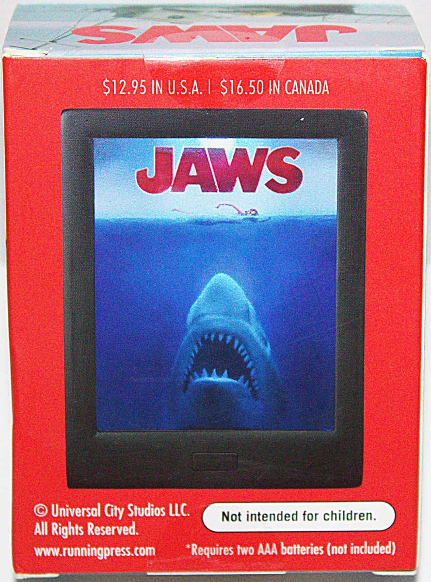 We’re going to need a bigger boat — and desk — because Jaws is here! This deluxe mini kit includes: 3″ Jaws collectible shadow box inspired by the iconic 1975 movie poster with a spotlight and button that plays the chilling, iconic theme music. It also includes an illustrated magnet. Requires two AAA batteries (not included). This is a new, sealed copy from our files that we purchased directly from the publisher and it has been stored in a smoke and pet free environment.