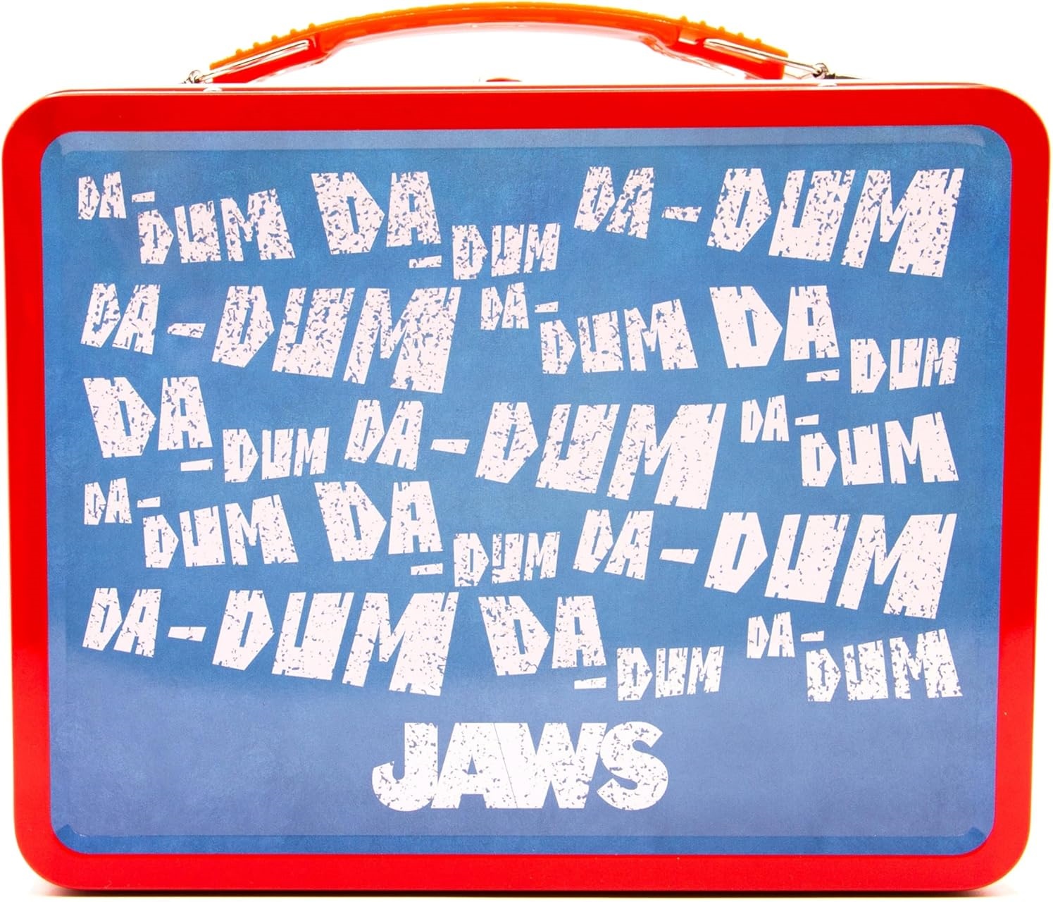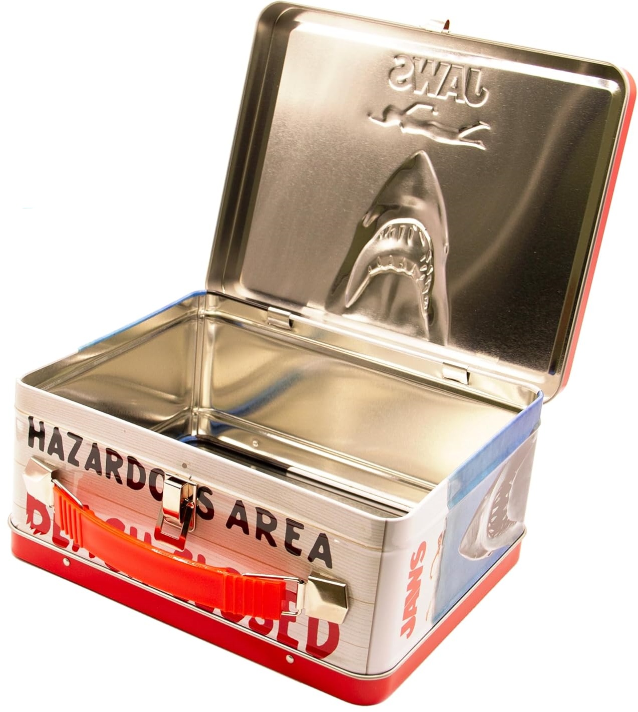 This is an 8.75″ x 6.75″ x 4″ metal tin tote/fun box or lunchbox featuring the image of the shark poster for the 1975 movie Jaws. It features full-color images along the sides and on the front, which is embossed. The back has the classic Da-Dum from the haunting soundtrack. It is a new, unused tin tote/lunchbox with a collapsible plastic handle and durable metal latch closure, stored in a smoke and pet free environment.