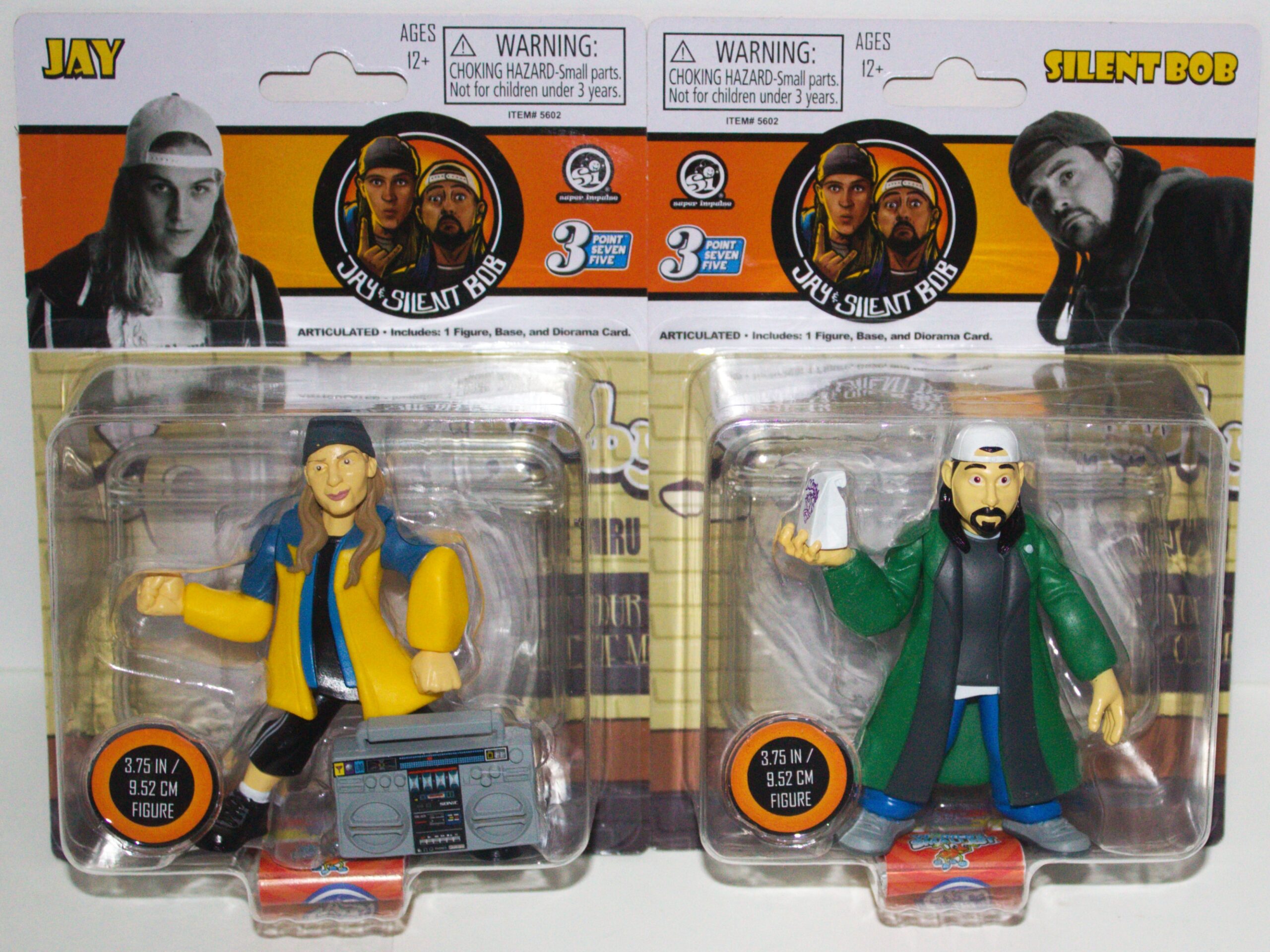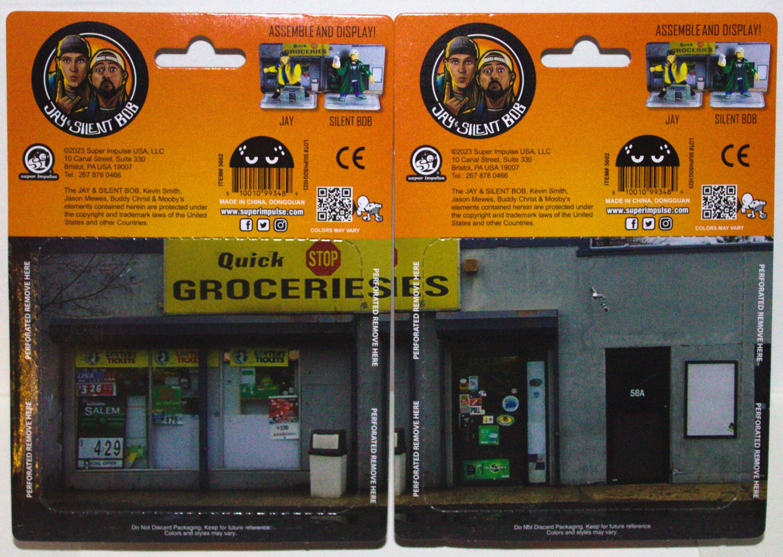 Produced by Super Impulse, this features the characters of Jay and Silent Bob from Kevin Smith’s View Askewniverse. The figures are approximately 3.75″ tall, and from Jay’s iconic boombox to Silent Bob’s milk carton, each figure captures the essence of these beloved characters with incredible detail! These detailed figures feature 3 points of articulation and come with a base and diorama card to help you grow your collection!. We pulled these from a sealed case that we bought direct from Super Impulse and they have been stored in a smoke and pet free environment.