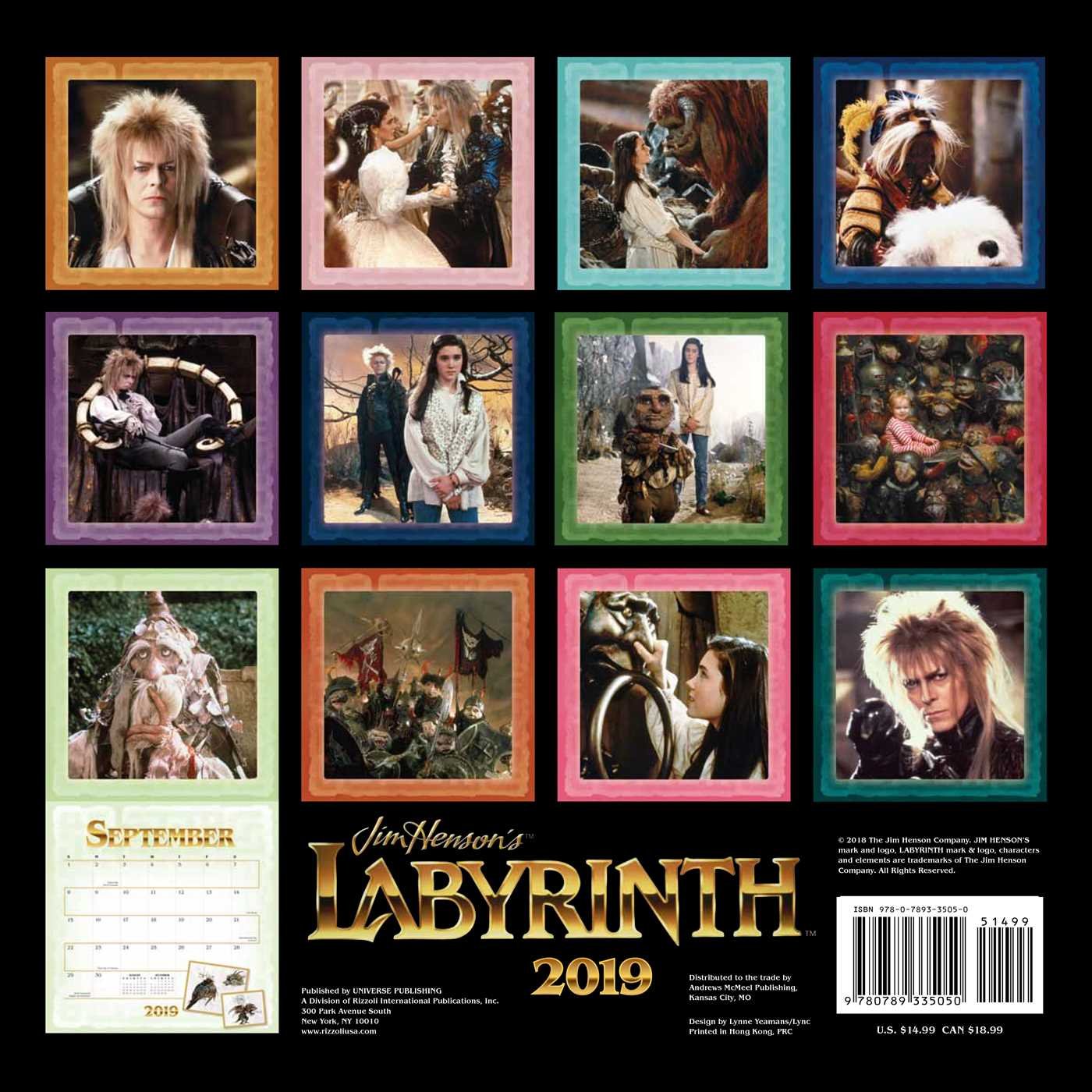 Printed by Universe Publishing and distributed by Andrews McMeel Publishing is this 2020 Wall Calendar features images from the iconic Jim Henson movie Labyrinth, now celebrating its 30th anniversary. Released 30 years ago, Labyrinth is a seminal film for an entire generation of fans, who are now passing their love for this movie on to their own children. Starring a young Jennifer Connelly as a babysitter who gets more than she bargained for when the idle wish she makes for her annoying baby brother to be taken away is granted by an evil goblin king…played by David Bowie. Sarah (Connelly) is given 13 hours to solve the titular Labyrinth, or else risk losing her brother forever. Directed by Jim Henson, and featuring creatures created by the world famous Henson Creature Shop, Labyrinth is a spectacle unlike any other. This is a new, unused, original shrink wrap copy from the publisher and is stored in a smoke and pet free environment.
