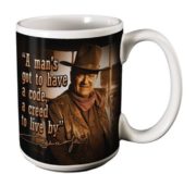 This is a new and unused 12 ounce ceramic mug featuring a wraparound photo image of John Wayne in his western garb in Monument Valley and his famous quote “A man’s got to have a code, a creed to live by” on the back. This mug is microwave and dishwasher saf, comes in an illustrated box and is stored in a smoke and pet free environment.