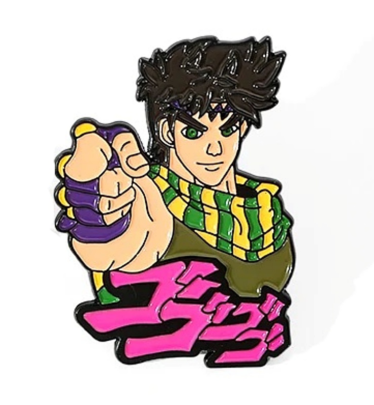 This is a 1.8755″ high x 1.375″ wide metal enamel pin featuring Joseph “JoJo” Joestar pointing, from the popular Japanese manga series JoJo’s Bizarre Adventure. It is in new, unused condition stored in a smoke and pet free environment.