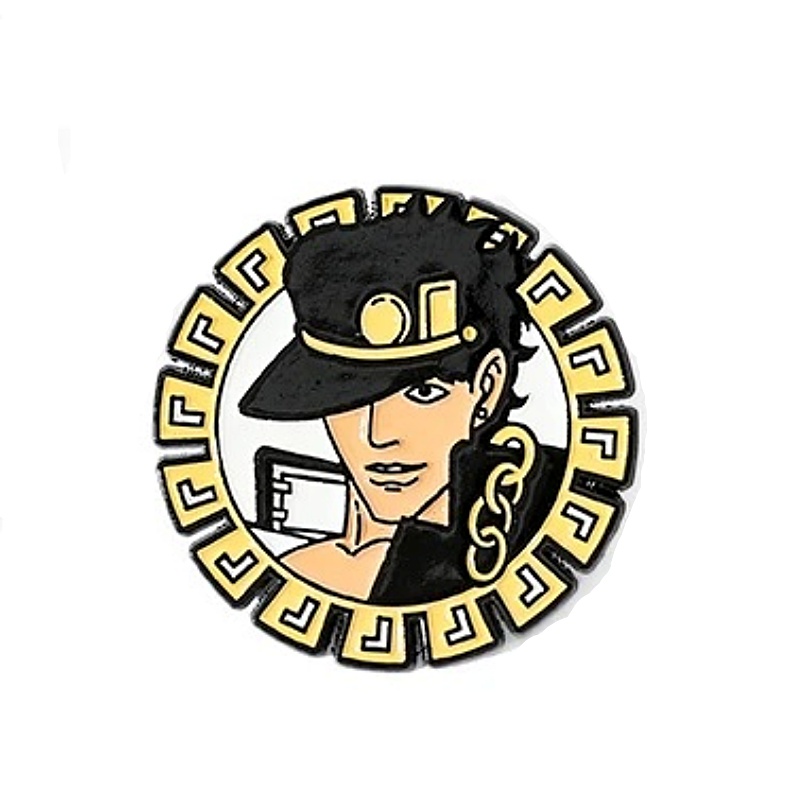 This is a 1.375″ diameter metal enamel pin featuring Jotaro “JoJo” Kujo in a circle, from the popular Japanese manga series JoJo’s Bizarre Adventure. It is in new, unused condition stored in a smoke and pet free environment.