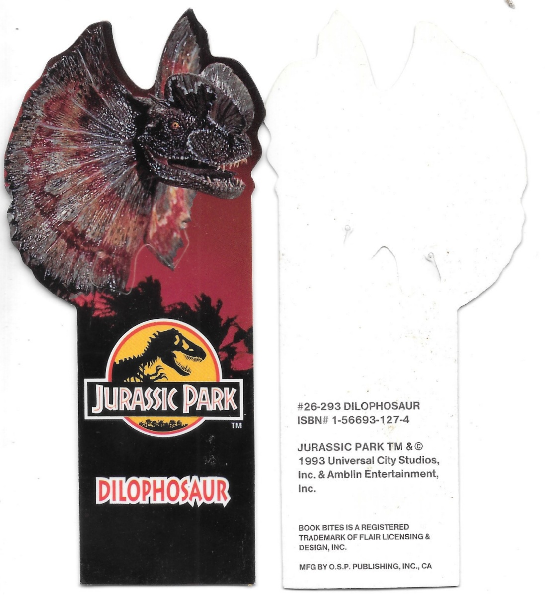 Produced in 1993 by OSP Publishing, this bookmark has the image of a Dilophosaur as seen in the original Jurassic Park movie. Measuring 4.875″ high and 2.25″ at the widest this is a die-cut, unused bookmark that we purchased at the time of manufacture, stored in a smoke and pet free environment. The middle under the Diloposaur pushes out to lock over the page you wish to mark.