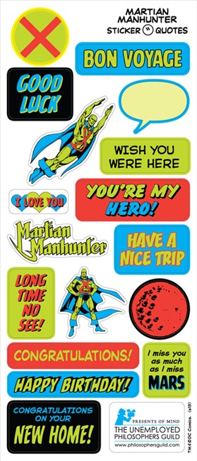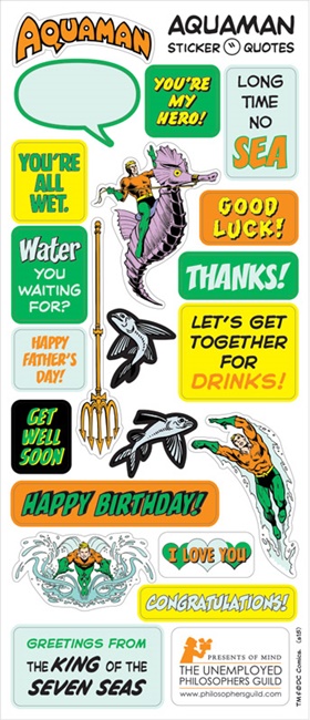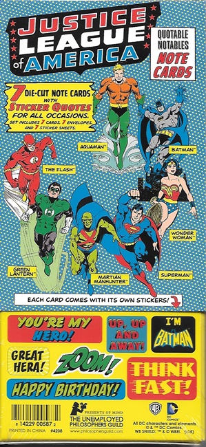 Produced by UPG in 2015, this is a boxed set of seven different quotable notables blank note cards featuring DC Comics super hero team The Justice League of America. This boxed set includes die-cut note cards of the founding members of the Justice League of America: Aquaman! Batman! The Flash! Green Lantern! Martian Manhunter! Superman! Wonder Woman! Each one comes with sticker sheets filled with super greetings, super images, and super quotes for all occasions! This is a new, never used set of note cards still sealed in its original display box.