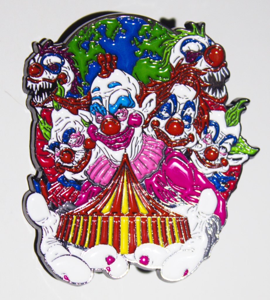 This metal enamel pin features a group image of the Klowns from the cult 1988 horror movie Killer Klowns From Outer Space. This new unused, pin measures 1.75″ high x 1.5″ wide and it is stored in a smoke and pet free environment.