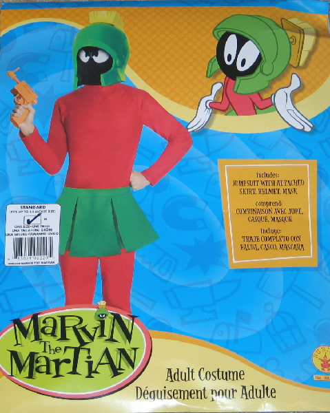 This is a licensed adult costume from Rubies featuring the popular Looney Tunes character Marvin the Martian. It contains a green and red jumpsuit and skirt plus a plastic helmet along with a cloth black mask and white gloves. This is a new, sealed costume that fits up to a size 44 jacket and is stored in a smoke and pet free environment.