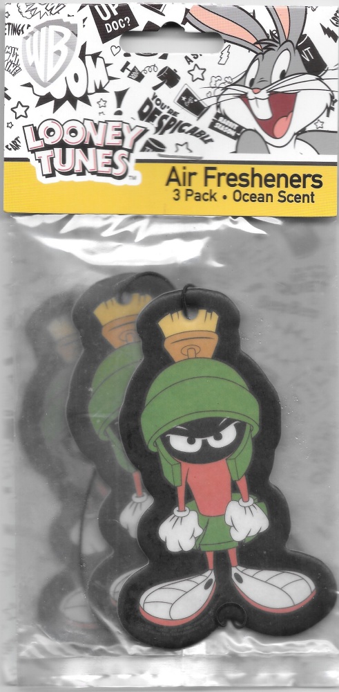 This is a set of three (3) illustrated ocean scent air fresheners featuring an image of a standing angry Marvin the Martian from the classic Looney Tunes cartoons. Measuring 4″ x 2.5″ these are new and unused sealed air fresheners stored in a smoke and pet free environment.