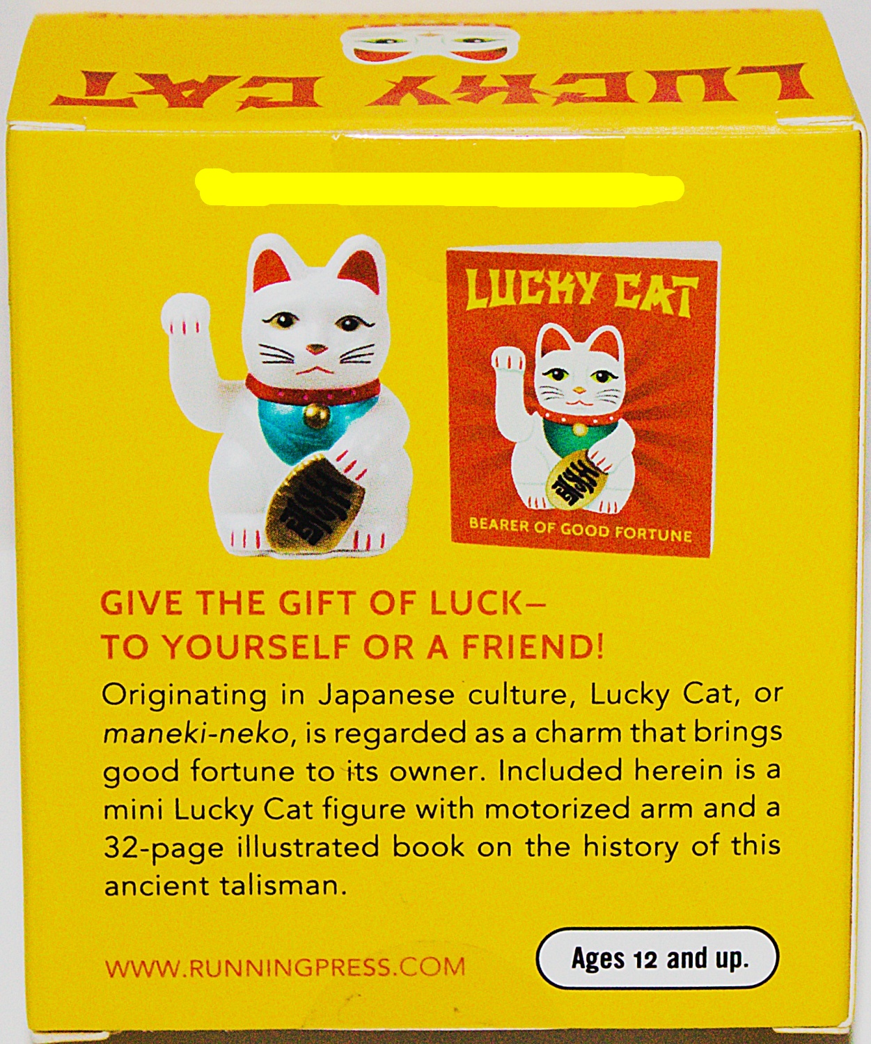 Originating in Japanese culture, Lucky Cat, or maneki-neko, is regarded as a charm that brings good fortune to its owner. Included herein is a mini Lucky Cat figure with motorized arm and a 32-page illustrated book on the history of this ancient talisman. This is a new, sealed copy that we purchased direct from the publisher and it has been stored in a smoke and pet free environment.