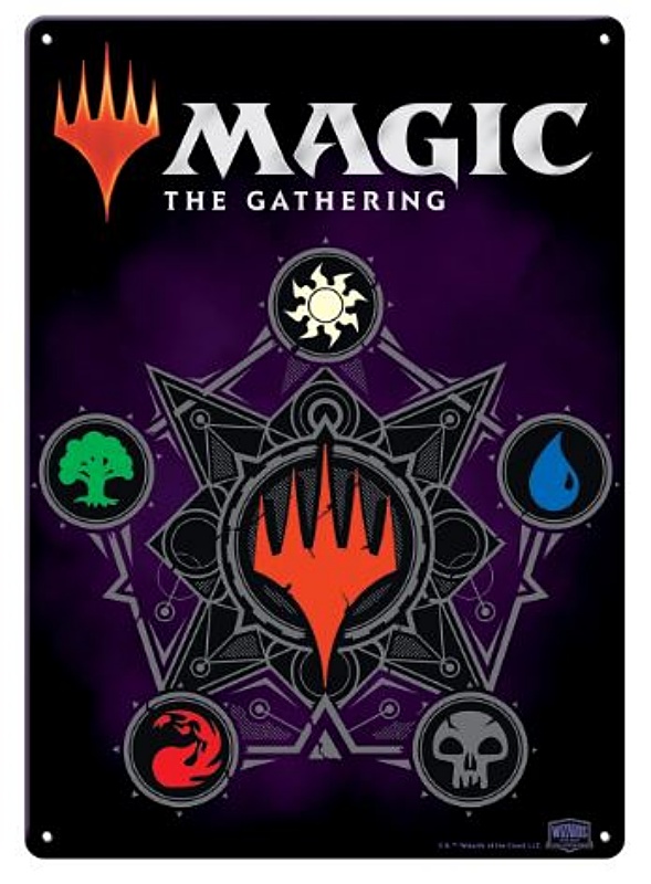 This is an 11.5″ x 8.25″ heavy grade metal sign poster that features the Mana symbols from the popular card game Magic the Gathering. These are produced in the style of the original metal signs that were common in the first half of the 20th century. It is a new, never used sign, complete with pin holes in the corners for easy hanging as well as a plastic tab on the top back side and protected in shrink wrap. These also look very nice framed. It has been stored in a smoke and pet free environment.