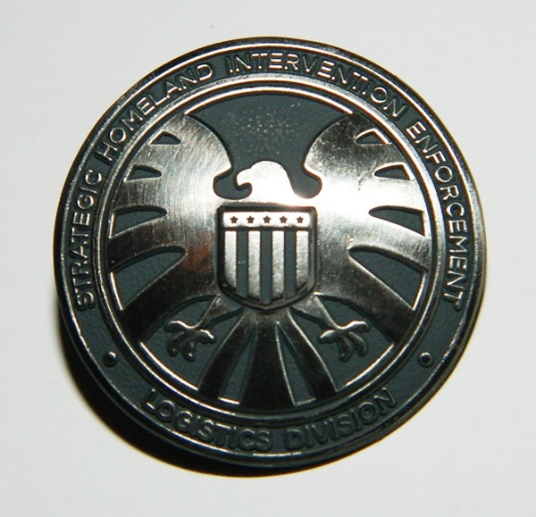 This is is a 1.25″ diameter, raised grey metal lapel pin logo image of the S.H.I.E.L.D. eagle logo seen on the TV series Agents of S.H.I.E.L.D. from Marvel Comics. This is a new unused logo pin still in its original packaging stored in a smoke and pet free environment.