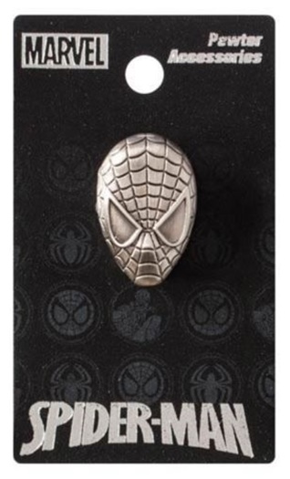 Produced by Monogram this is a licensed 1″ high, grey metal pewter lapel pin of the mask/head of Spider-Man based upon the comic book from Marvel Comics. This is a new unused logo pin still in its original packaging stored in a smoke and pet free environment.