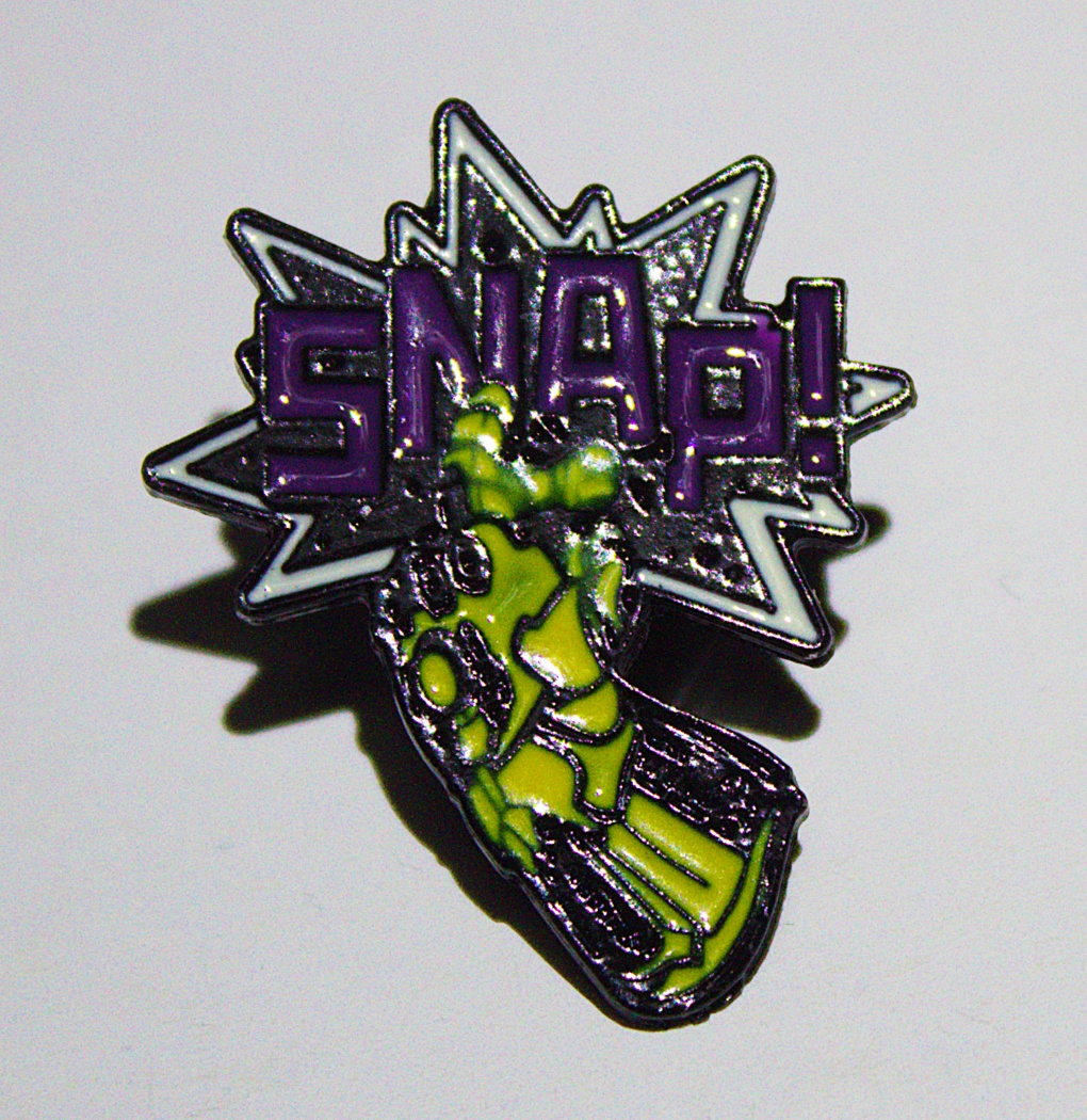 This is a 1.25″ high x 1″ wide, colored metal enamel lapel pin featuring the Infinity gauntlet worn by Thanos being give the SNAP! that changed the universe, as seen in the hit Marvel Comics movie Avengers Infinity War. This is a new unused logo pin still in its original packaging stored in a smoke and pet free environment.