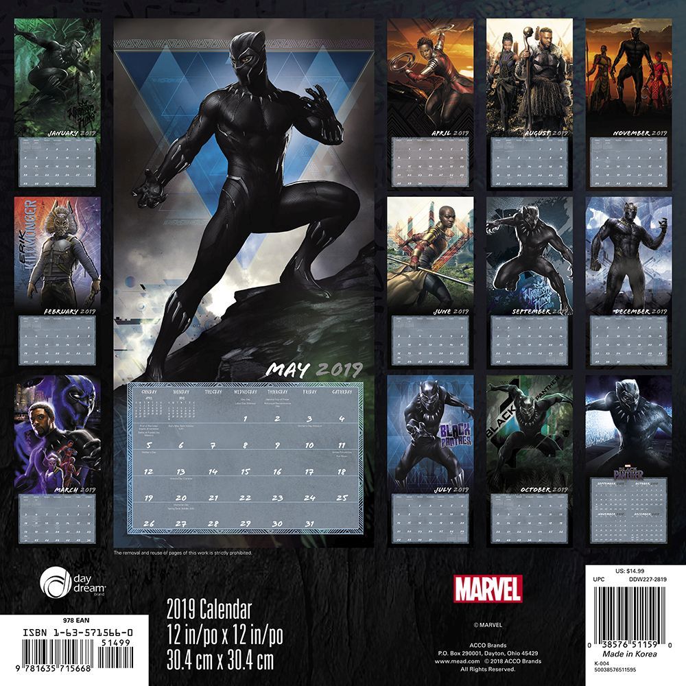 This is the 2019, 16 month wall calendar with images from the hit Marvel Comics Black Panther movie. After battling in Marvel’s Civil War, the heir to the T’Challa throne is forced to prevent a World War in Black Panther. Relive the exciting adventure in our action-packed 2019 calendar. This is a mint, unused, original shrink wrap copy, printed by Day Dream Publishing, stored in a smoke and pet free environment.