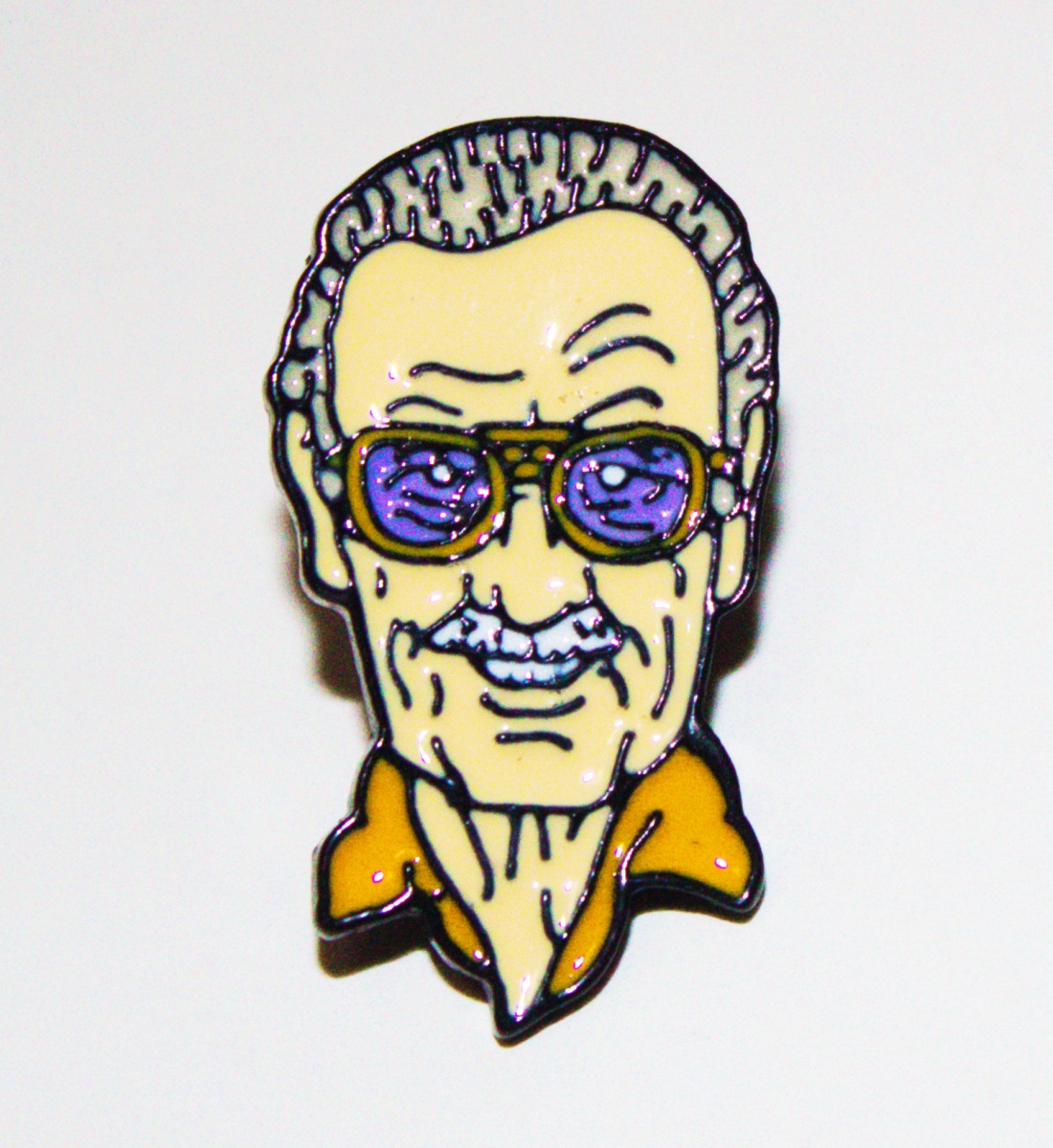 This mint, unused 1.125″ high colored enamel metal pin features the older face image of the former publisher, editor and creator of most of the main characters we love from Marvel Comics, Stan the Man Lee. This has not been a widely distributed pin, found usually at sci-fi and comic conventions. It has been stored in a smoke and pet free environment.