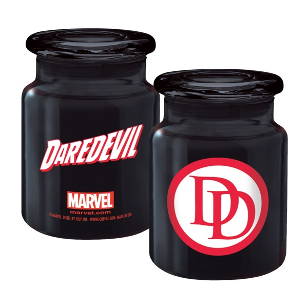This is a black apothecary style 6 oz jar featuring the comic art image of the DD logo of Marvel Comics Daredevil on the front and his name logo on the back. It measures 3.75″ high and comes with an airtight lid, perfect for storing those small items you want to keep fresh. It is new, unused and stored in a smoke and pet free environment.