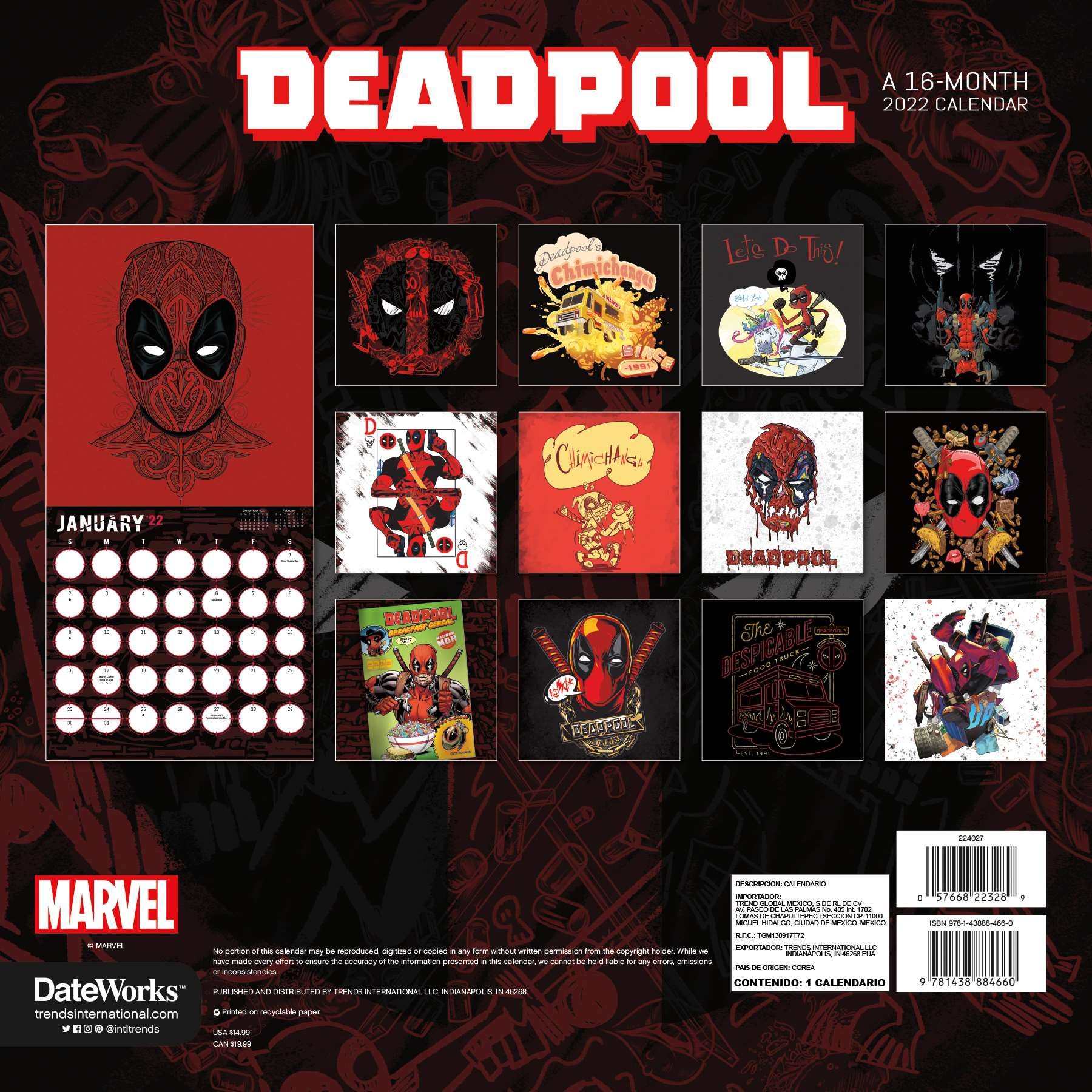 This is the 2022, 16 month wall calendar with comic art images of the super-hero Deadpool from the Marvel Comics universe. Looking for a more humorous approach to your troublesome schedule this year? Or perhaps more action and adventure so you won’t ever get bored? Marvel’s Wade Wilson has got you covered with this 2022 Marvel Deadpool Calendar. Never a dull moment with this love-chasing mercenary by your side. DateWorks 16-Month Wall Calendars include a page for each month of 2022, as well as the last four months of 2021. Each monthly calendar spread features enough room to mark important dates or write down reminder notes – making them perfect for staying organized and productive all year long. This is a mint, unused, original shrink wrap copy, printed by Trends Publishing and stored in a smoke and pet free environment.