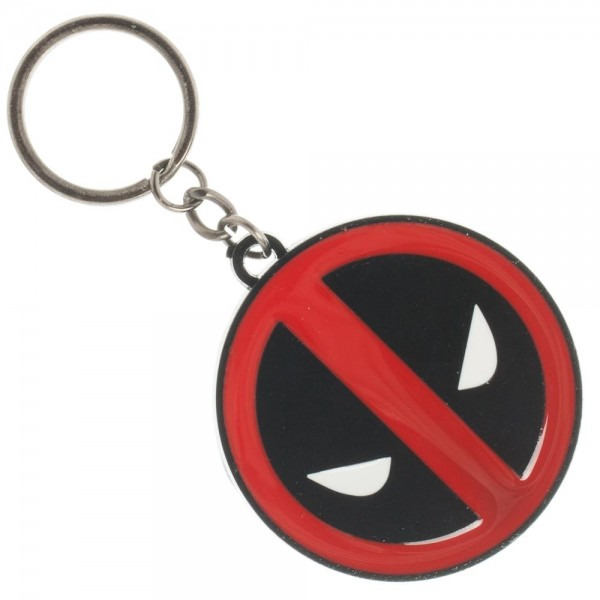 Produced by Bioworld this is a licensed 1.75″ diameter, red and black, metal keychain with the enamel colored eyes logo of Deadpool as seen in Marvel Comics. This is a new unused logo keychain still in its original packaging stored in a smoke and pet free environment.