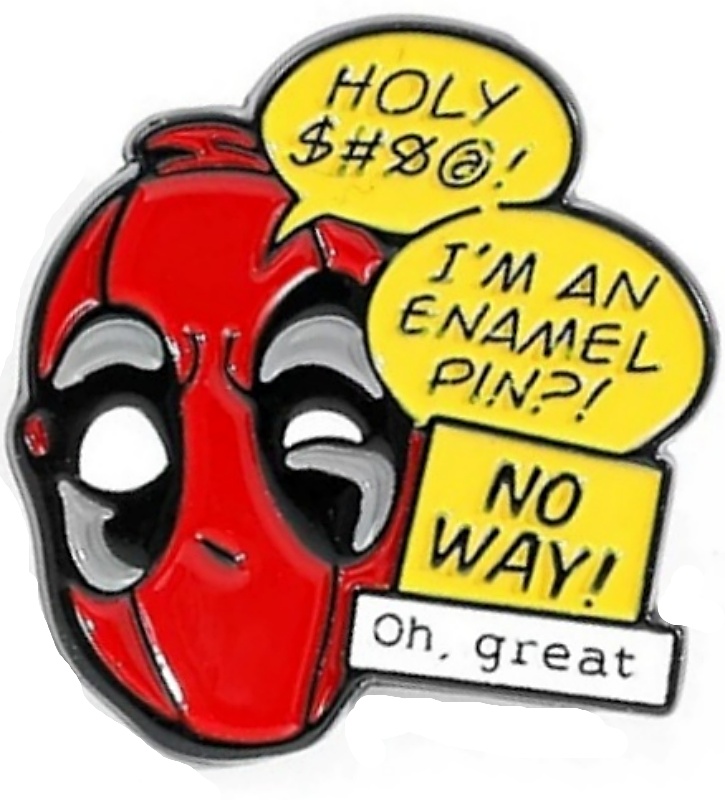This is a 1.25″ high x 1.125″ wide, colored metal enamel lapel pin logo of the face of Deadpool sayiing “Holy #&@! I’m An Enamel Pin?! No Way! Oh, Great” as seen in the Marvel Comic books. This is a new unused pin stored in a smoke and pet free environment.