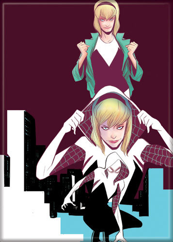 This is a licensed 2.5″ x 3.5″ magnet featuring the comic art reproduced image of Marvel Comics Gwen Stacy changing to Spider-Gwen. It has been stored in a smoke and pet free environment.