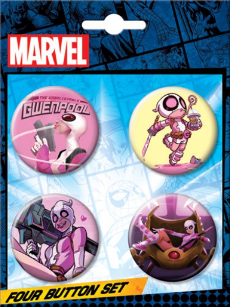 This is set of four 1.25″ wide round buttons that features comic art images of Gwenpool as seen in Marvel Comics. They are attached to an illustrated card, are new and unused and are stored in a smoke and pet free environment.