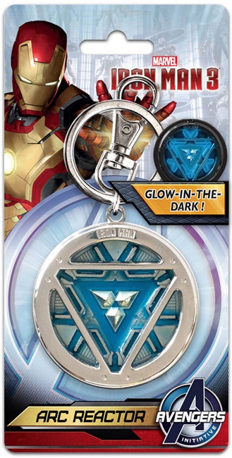 Produced by Monogram in 2014 is this 2″ high pewter metal key ring/keychain in the 3-D image of the arc reactor Iron man wears on his chest based upon the comic book from Marvel Comics. This is a mint, unused key ring stored in a smoke and pet free environment.